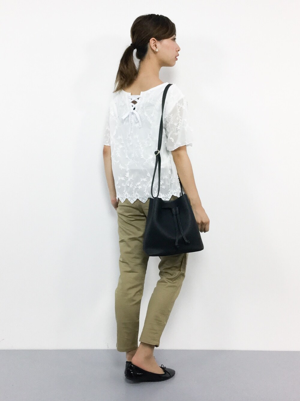 大人カジュアルコーデ◎ ふんわりとしたシルエットの プルオーバーは、フェミニンな印象に♪ バックスタイルもかわいいですよ〜(^O^) トップス、ボトムス共にセール中です♪