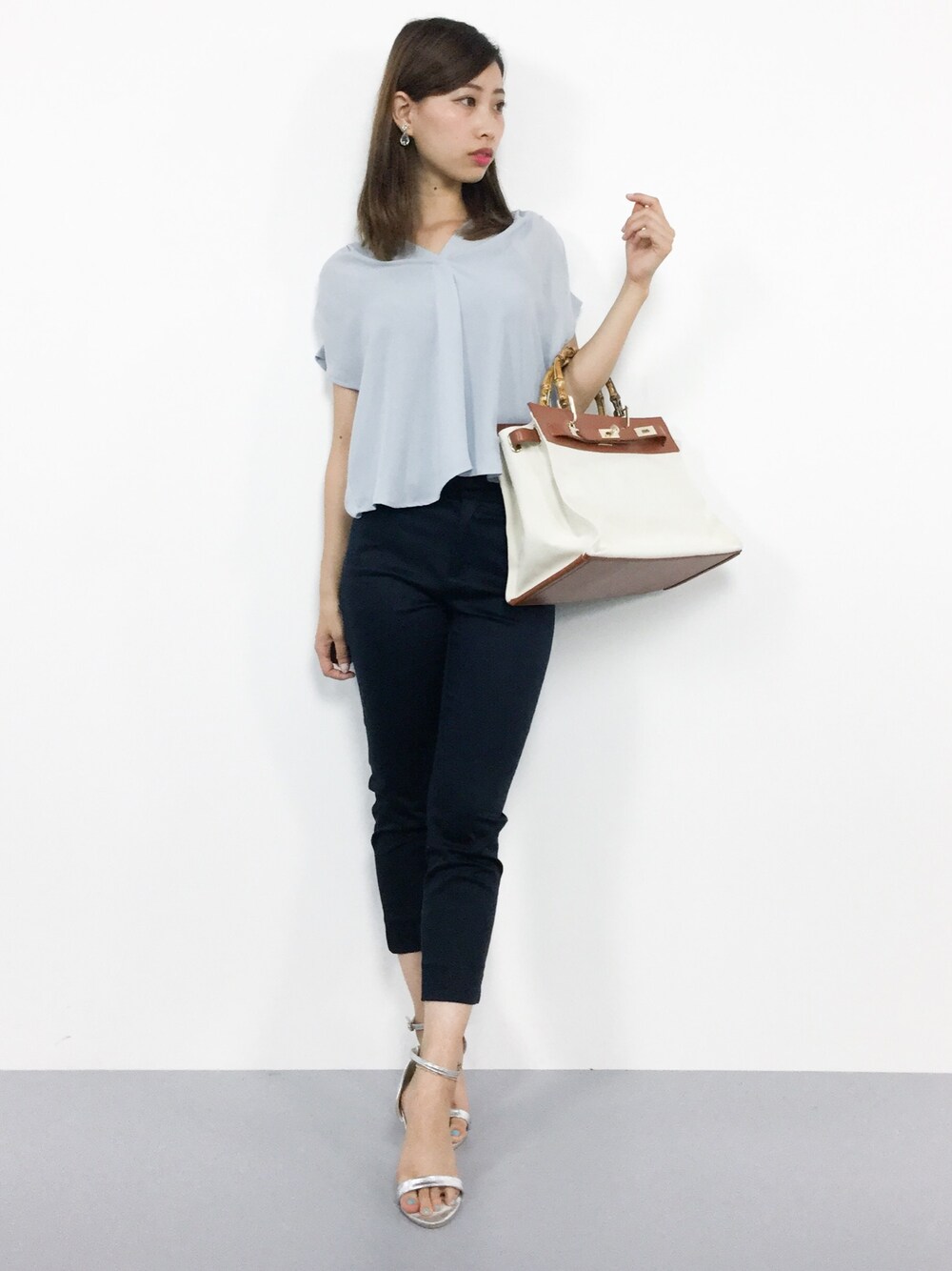 オフィスカジュアルコーデ◎ 伸縮性のあるパンツは スッキリシルエットで 脚がきれいに見えますよ(^O^)