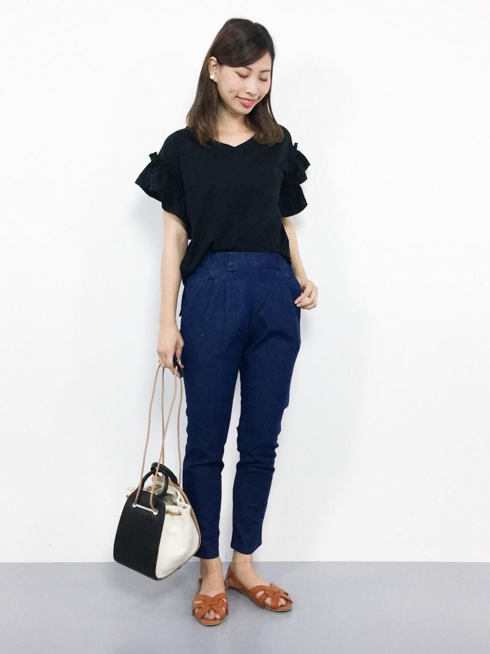 カジュアルプチプラコーデ◎ 大きなフリルがぴポイントの トップスはただいまセール中♪ デニムのテーパードパンツは 伸縮性があり、履き心地◎
