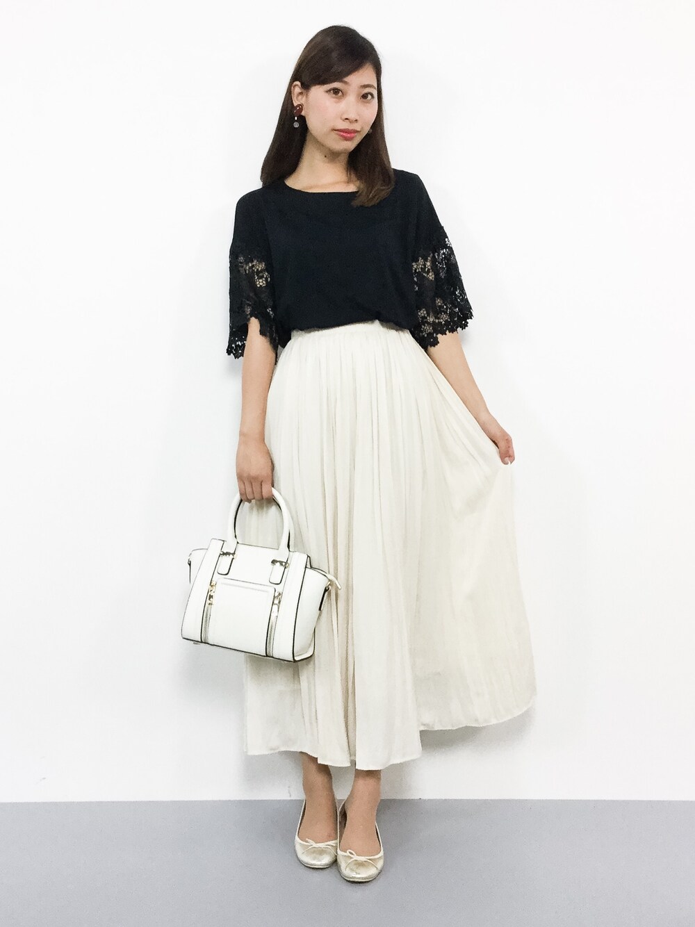 ゆったりフェミニンコーデ◎ 袖にレースが施されたトップスは 肌触り、着心地がとてもいいです♪ 光沢のある生地のスカートは 上品に着こなしてみました‼︎