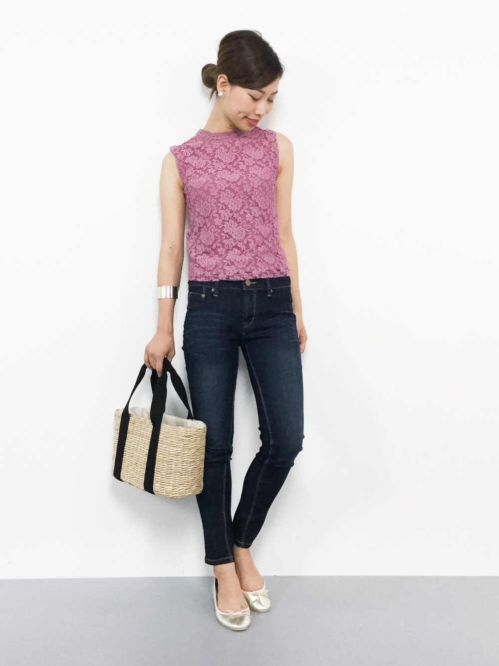 summerカジュアルコーデ◎ ピンクのレーストップスは、 伸縮性があり、着やすいです♪ デニムもストレッチが効いていて 履きやすいですよ〜(^O^)