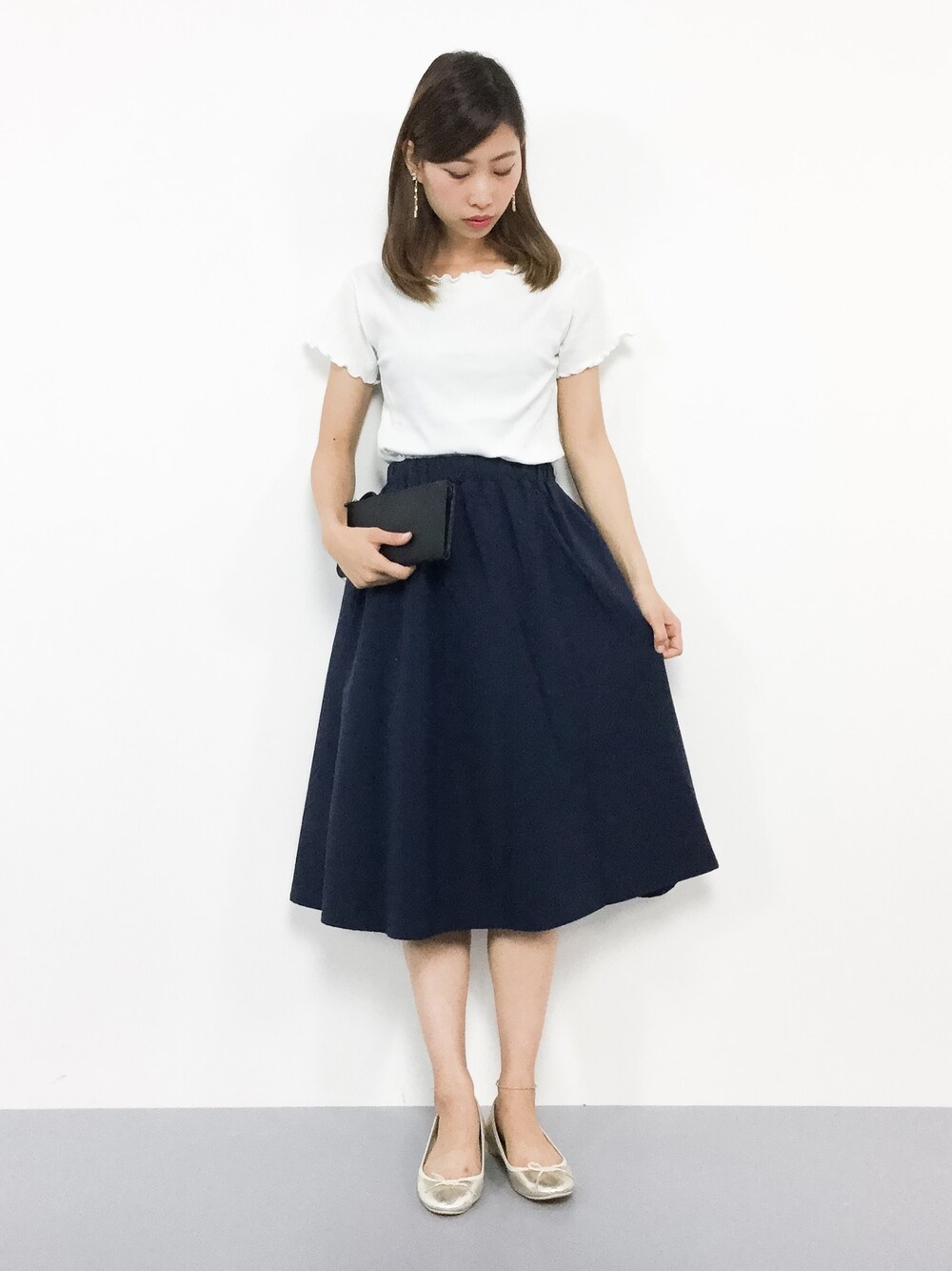 モノトーンコーデ○ ゴールドのバレエシューズがポイントです♪ 程よくフィットするトップスは 伸縮性があるので着心地◎ ふわっとした形のスカートは 下半身をさりげなくカバー♪