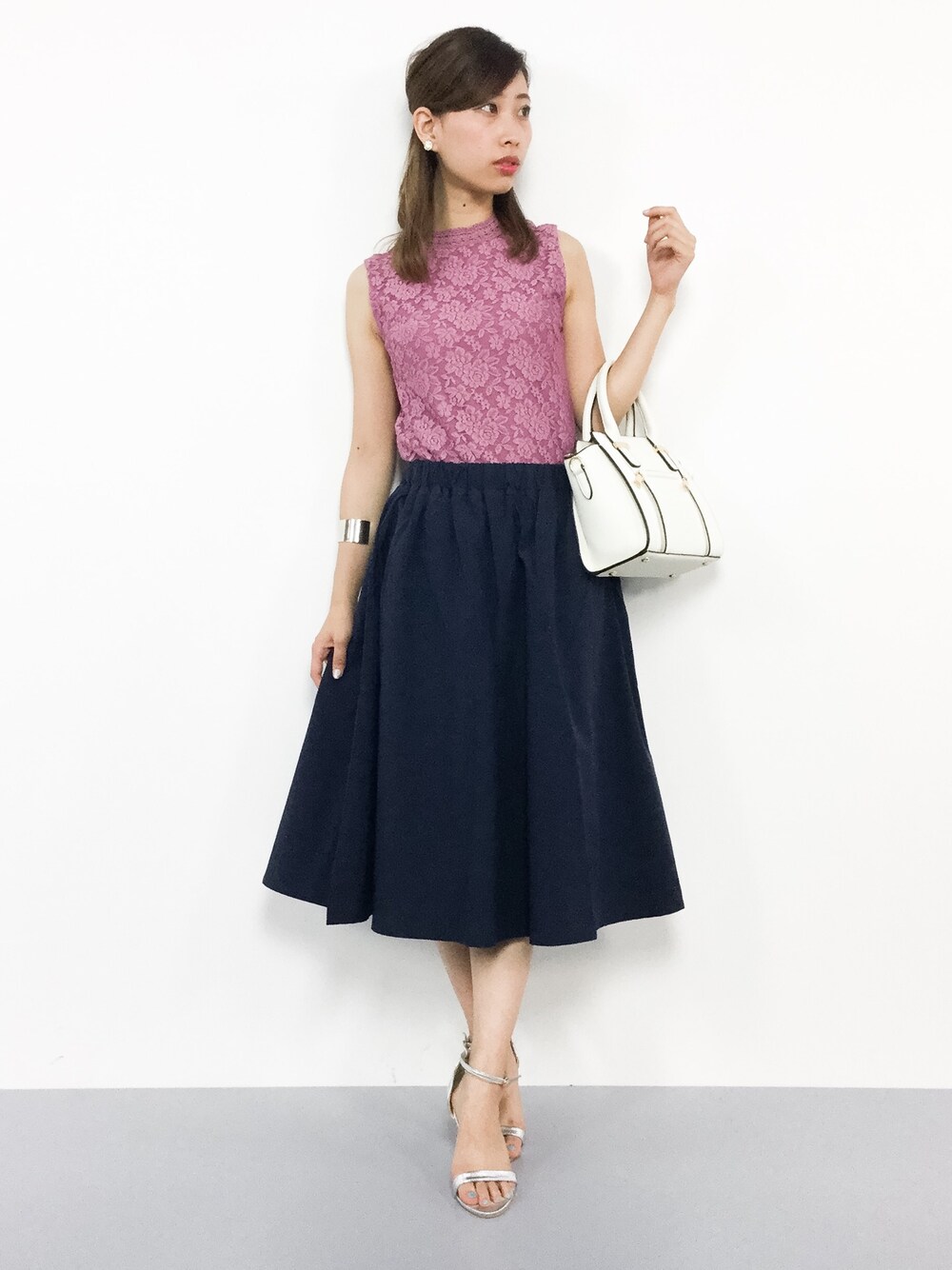 オトナフェミニンコーデ◎ タイトなシルエットのトップスですが、 伸縮性があるのでラクな着心地♪ フレアなスカートは女性らしく フェミニンな印象に(^O^)