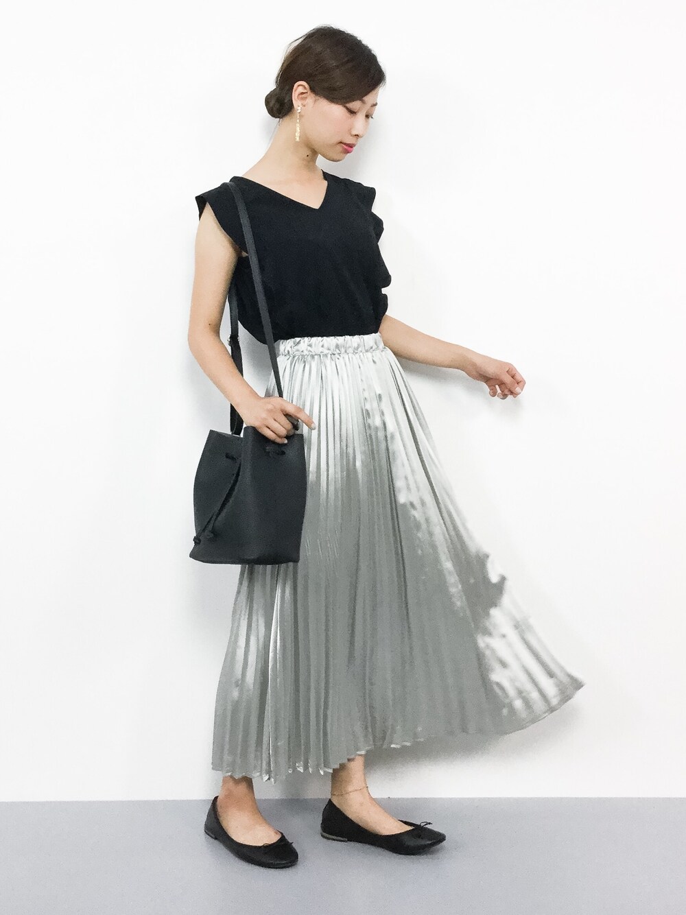 オトナデートコーデ◎ シンプルなフリルブラウスには、 今季トレンドのシルバーの プリーツスカートをチョイス♪