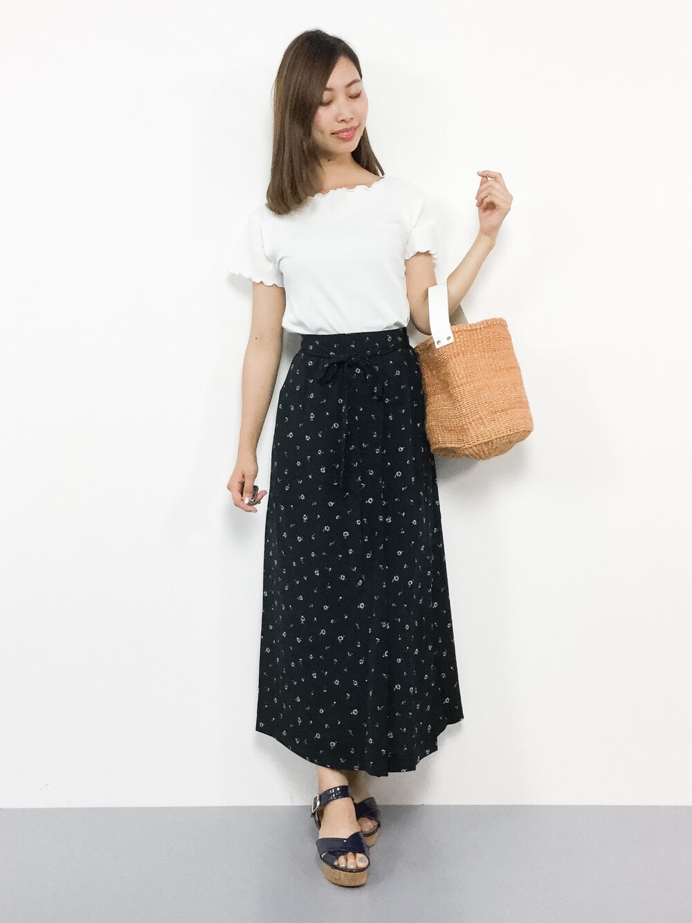 カジュアルガーリーコーデ◎ 柔らかなシルエットのスカートに フリルがかわいいトップスを合わせて カジュアルガーリーに仕上げました♪