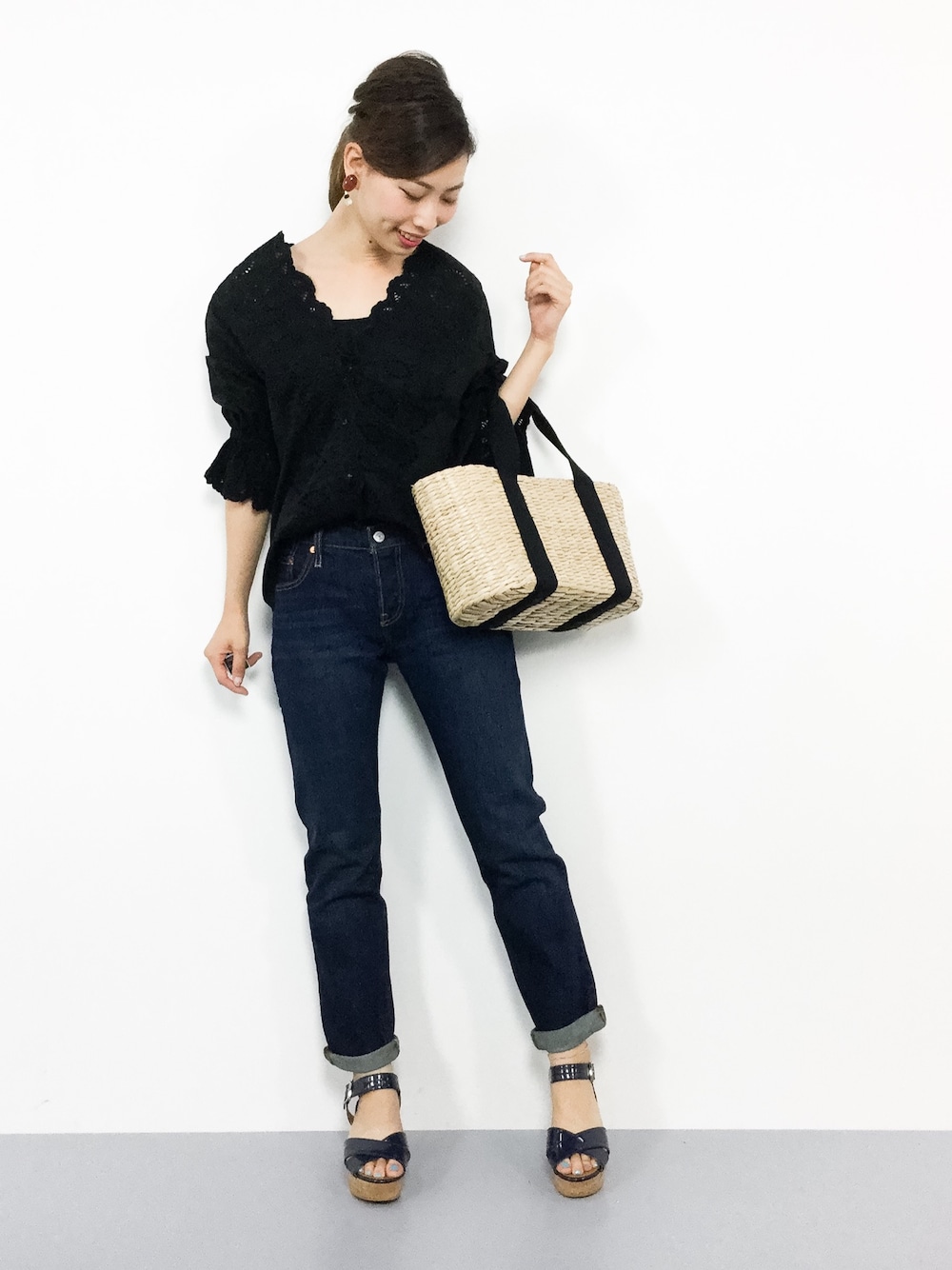 カジュアルガーリーコーデ◎ レースブラウスはテーパード デニムと合わせてカジュアルに♪ トレンドのブラウスは シンプルはブラックで 着回し抜群です(^O^)