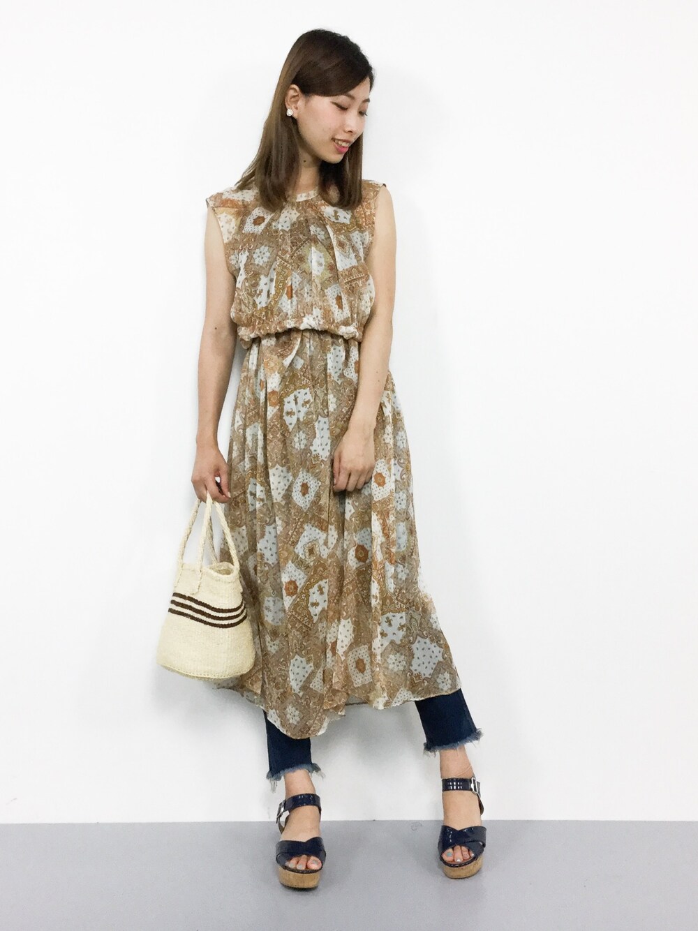 リゾート感たっぷりの柄ワンピを、 デニムと合わせてカジュアルに◎ 透け感があって、涼しげ♪
