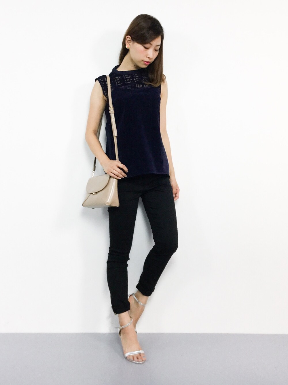 オトナワントーンコーデ○ オンオフに着回しが効くレーストップスは 様々なシーンで活躍間違いなし♪ パンツは伸縮性抜群で穿きやすさ満点◎