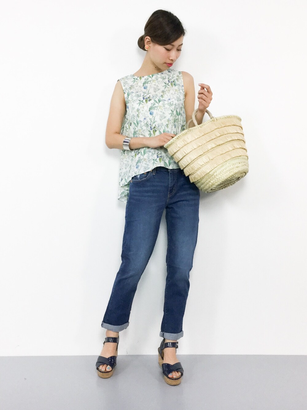カジュアルsummerコーデ◎ すそが広がるブラウスはフェミニンな印象♪ ゆったりしたボーイズデニムで カジュアルさをプラスしました(^O^)