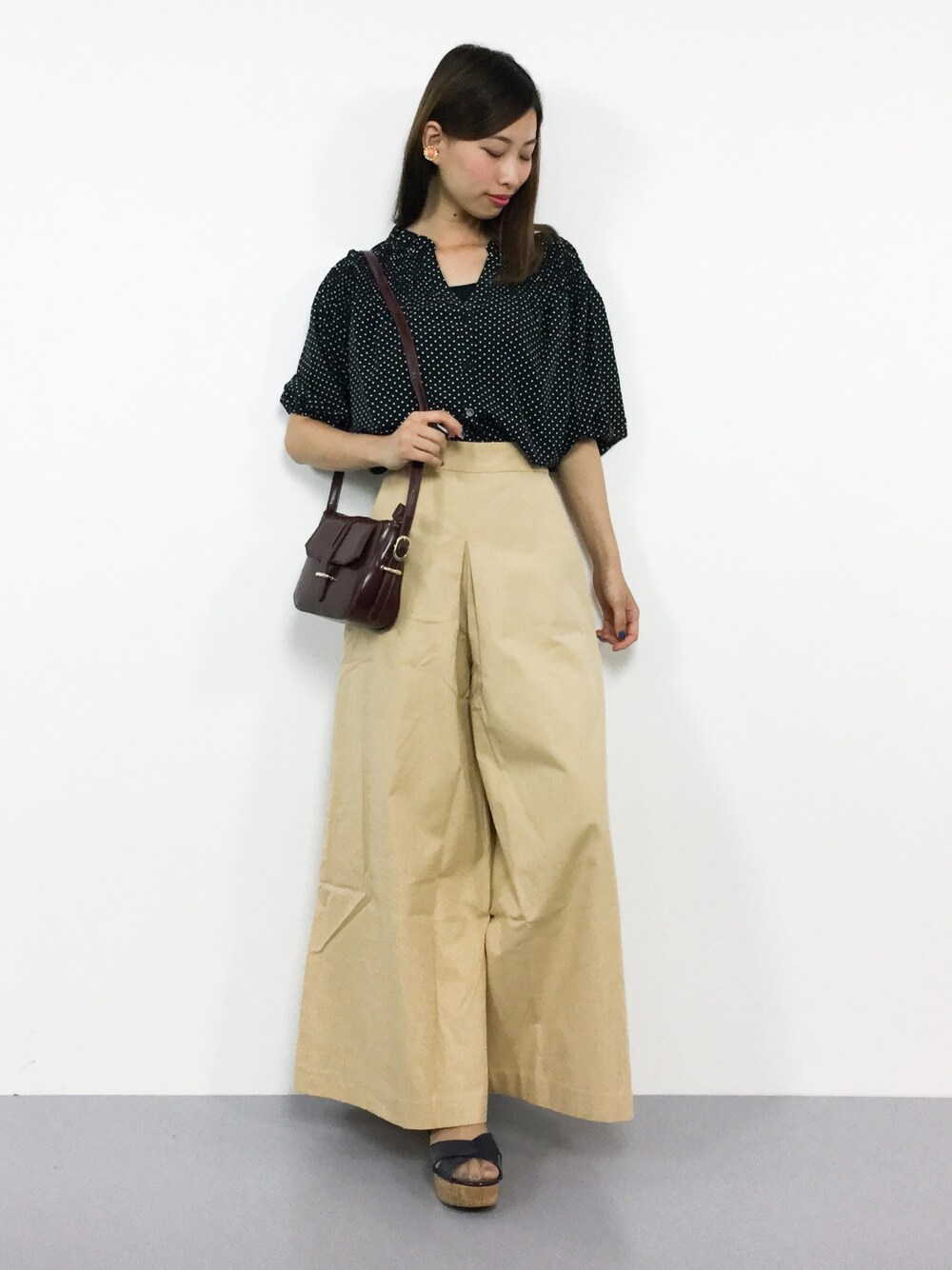 ゆるカジコーデ◎ ドット柄のブラウスはオトナかわいく 着られる今季トレンドアイテム♪ シンプルなワイドパンツと合わせて、 カジュアルスタイルに仕上げました(^O^)