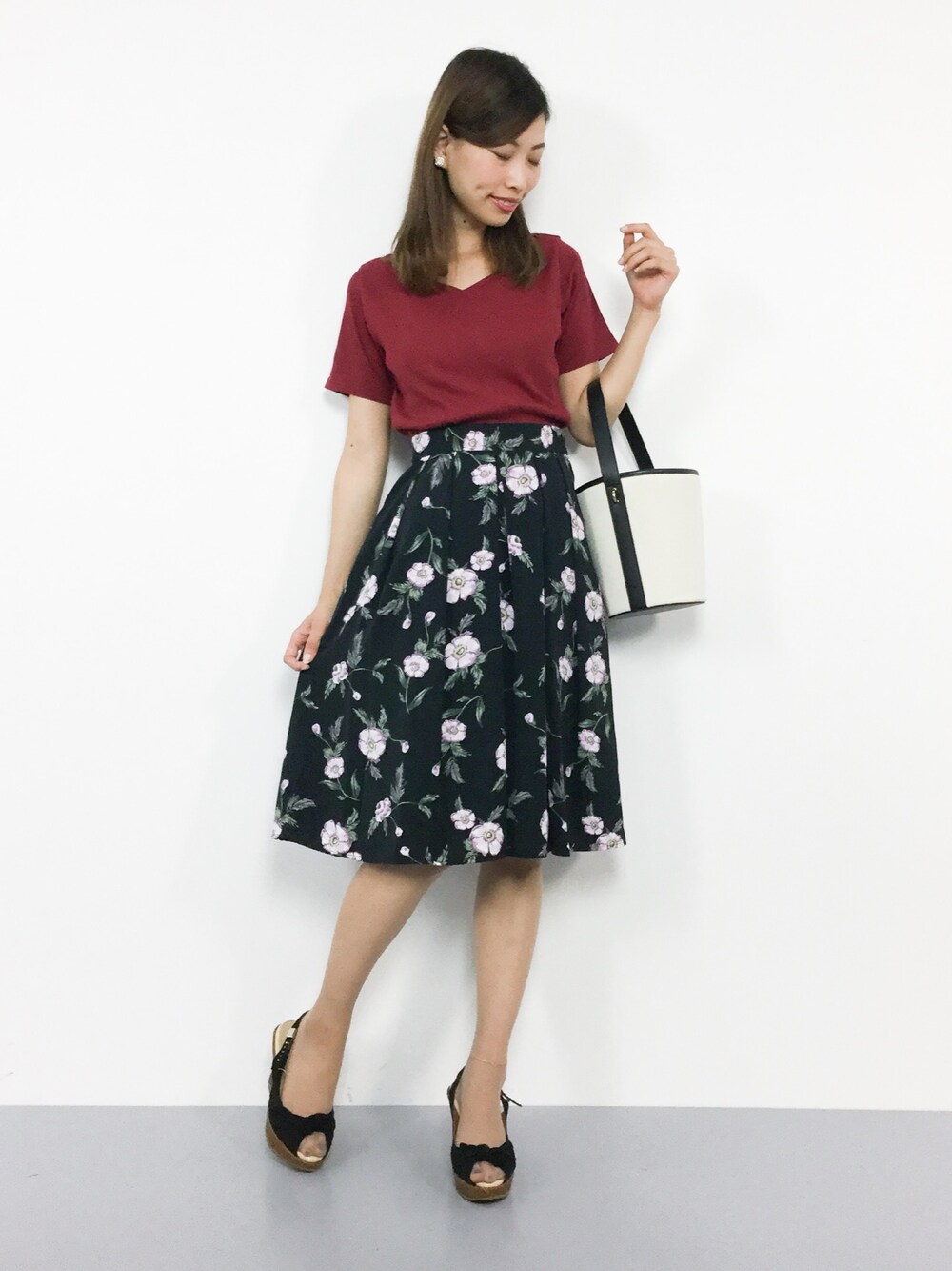 デートコーデ◎ 程よくフィットするトップスは 伸縮性がしっかりあるので 着やすいですよ(^O^) デイリーに着回しが効く花柄スカートは 様々なシーンで活躍間違いなし♪