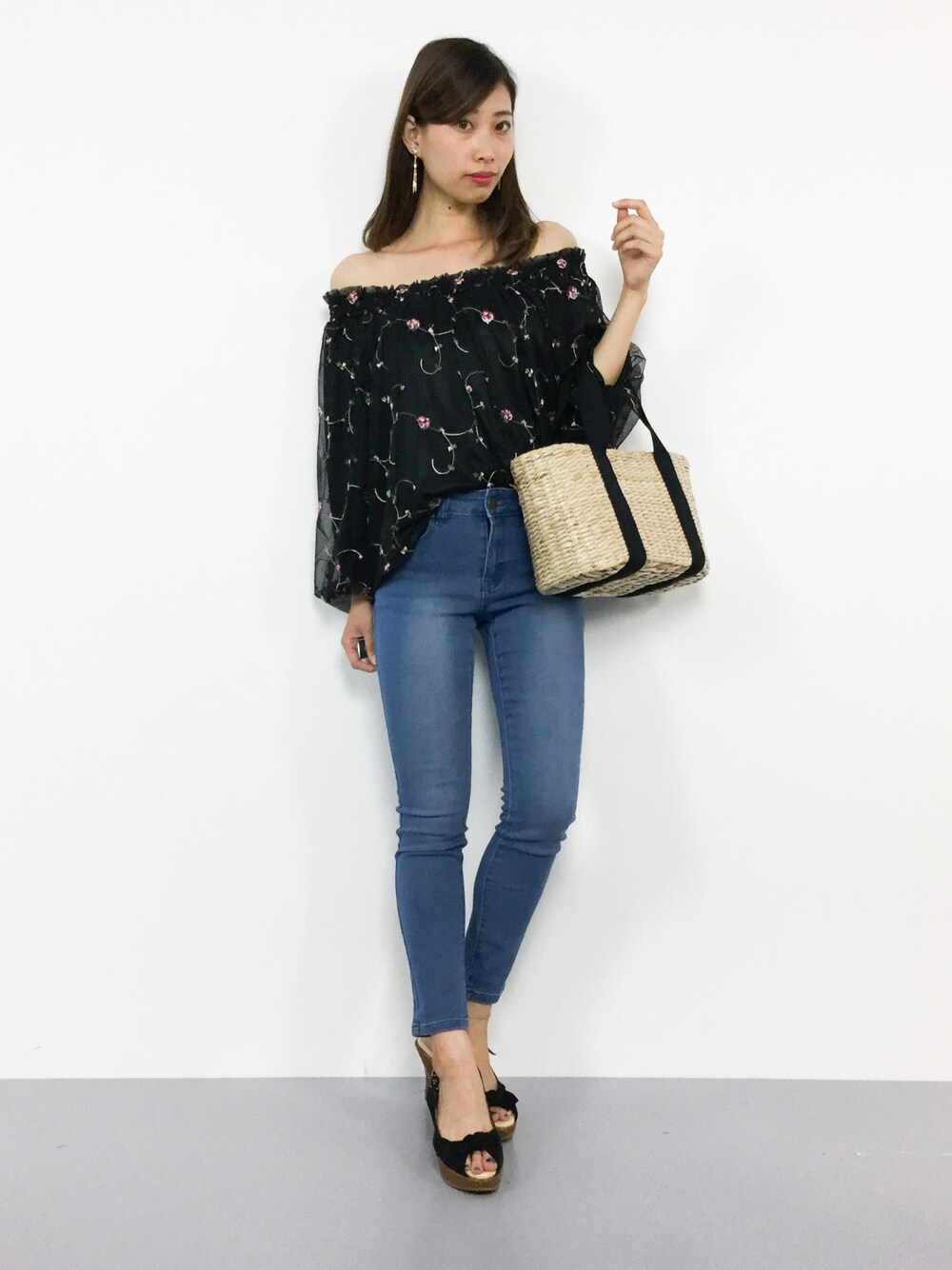 カジュアルガーリーコーデ◎ フェミニンなシルエットのオフショルは シンプルなスッキリシルエットの デニムと合わせてカジュアルダウン♪ カゴバッグは軽くてお荷物たっぷり 入りますよ(*゚▽゚*)