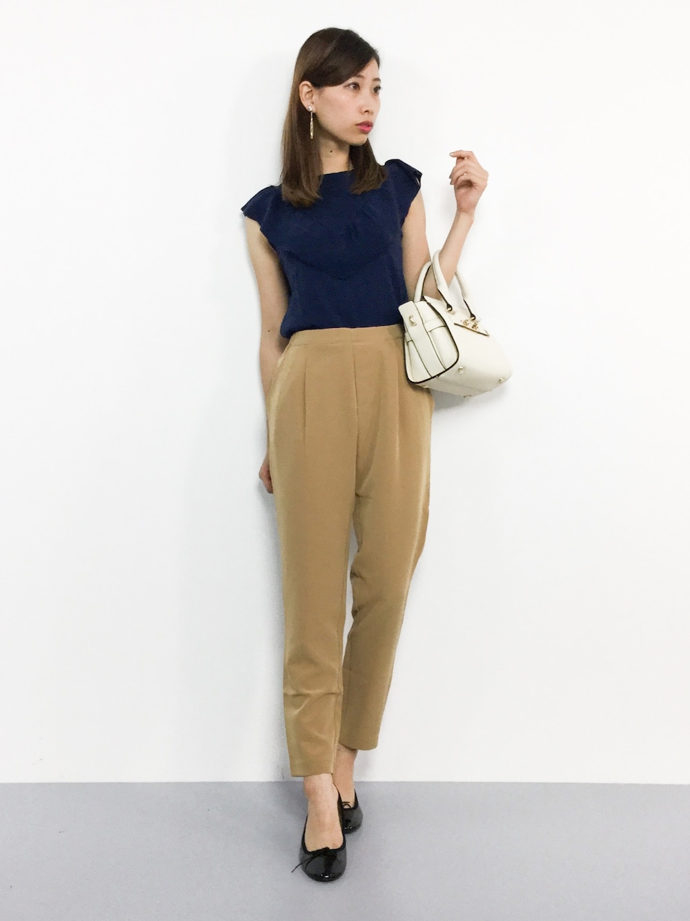 オフィスカジュアルコーデ◎ ニットは落ち着いた色味でフリルでも 甘すぎずに着られます(^_^)☆ シンプルなテーパードパンツは プチプラ価格‼︎お値段以上のアイテムです♪