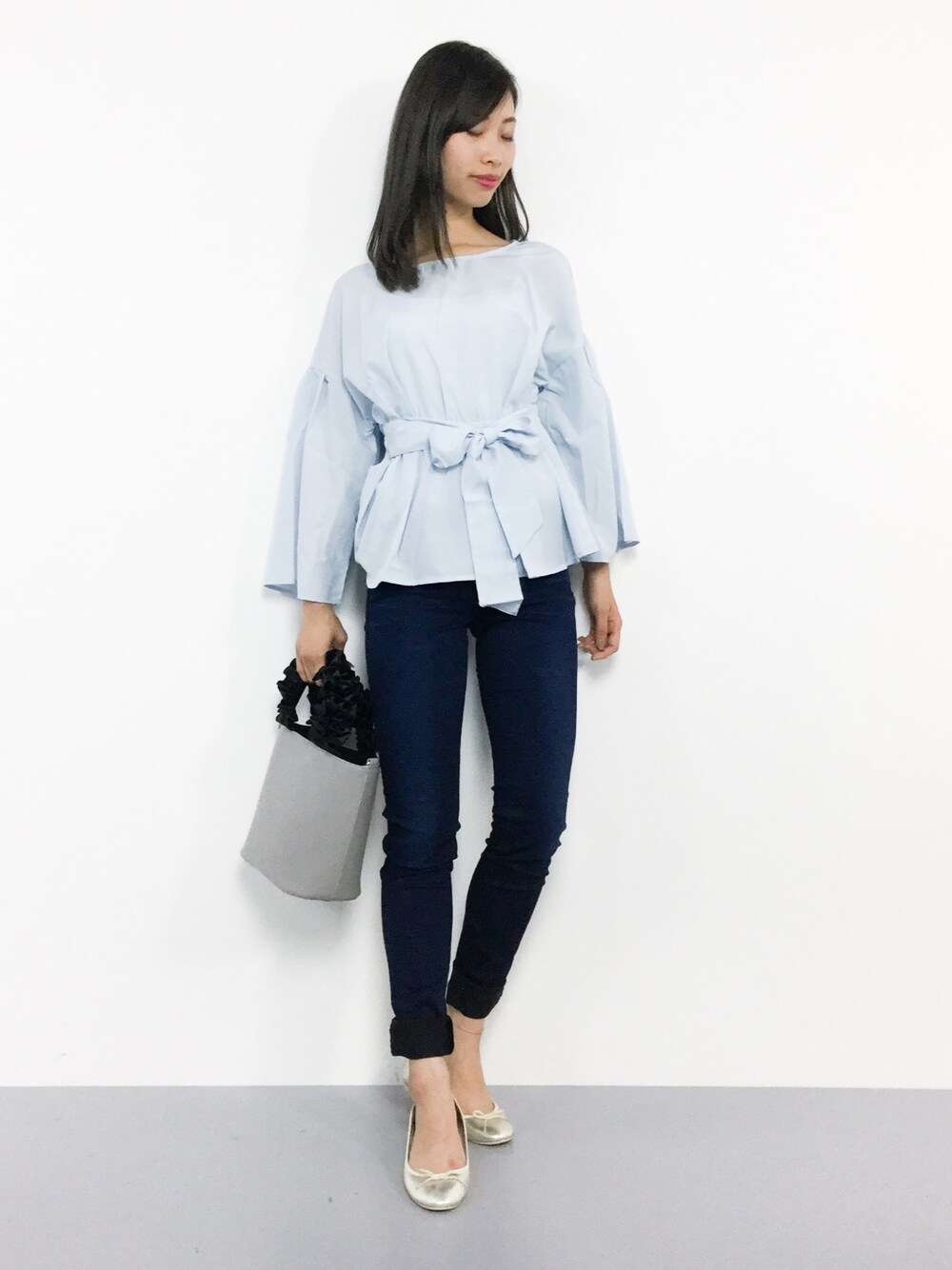 きれいめカジュアルコーデ◎ サラっとした生地で着やすさ満点♪ フレアスリーブはフェミニンな 印象できれいめに着られますよ(*゚▽゚*) フリルがかわいいトートバッグは ショルダーバッグにもなり、 デイリーに使えるアイテムです♪