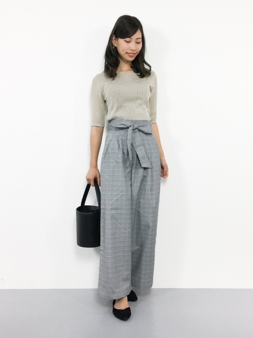 シンプルコーデ◎ やや薄手のラメニットは 今の時期から着ていただけます♪ 柔らかな生地のワイドパンツは ウエストがゴムなので穿きやすいです(*゚▽゚*) ゆったりシルエットでラクチンです♪