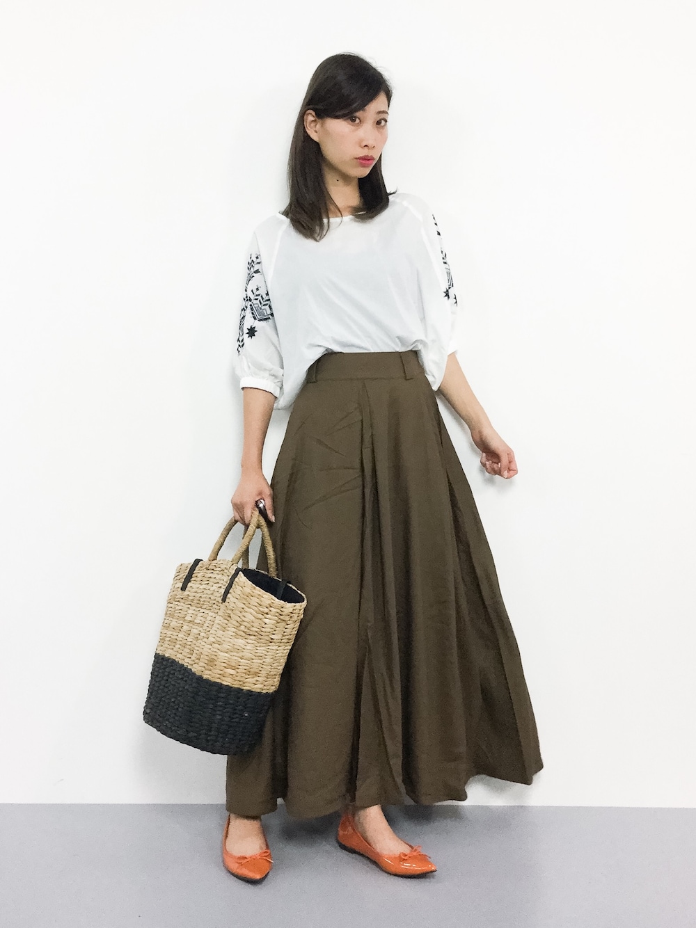 ゆるコーデ◎ 袖の刺繍がフェミニンで可愛らしい ブラウスはゆるシルエットで着心地◎です♩ ボリュームスカートはトップスを 選ばずに穿けるので合わせやすいですよ(^_^)