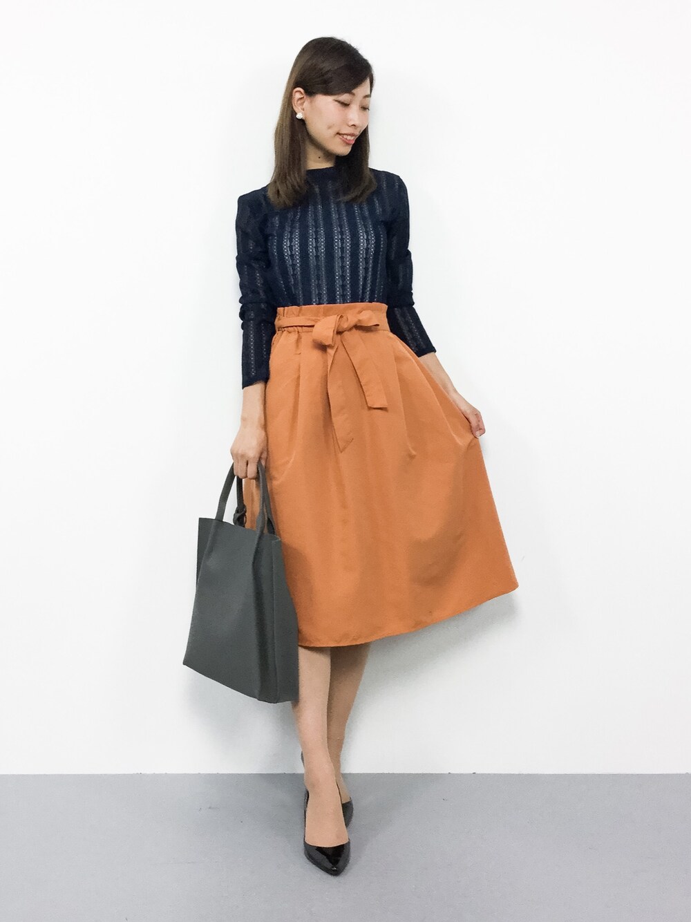 オトナ女子コーデ◎ ゆったりシルエットのレーストップスなので、 ウエストマークができるボトムスで バランス良く(^O^)♩ スカートはデイリーに穿き回せそうです(^_^)