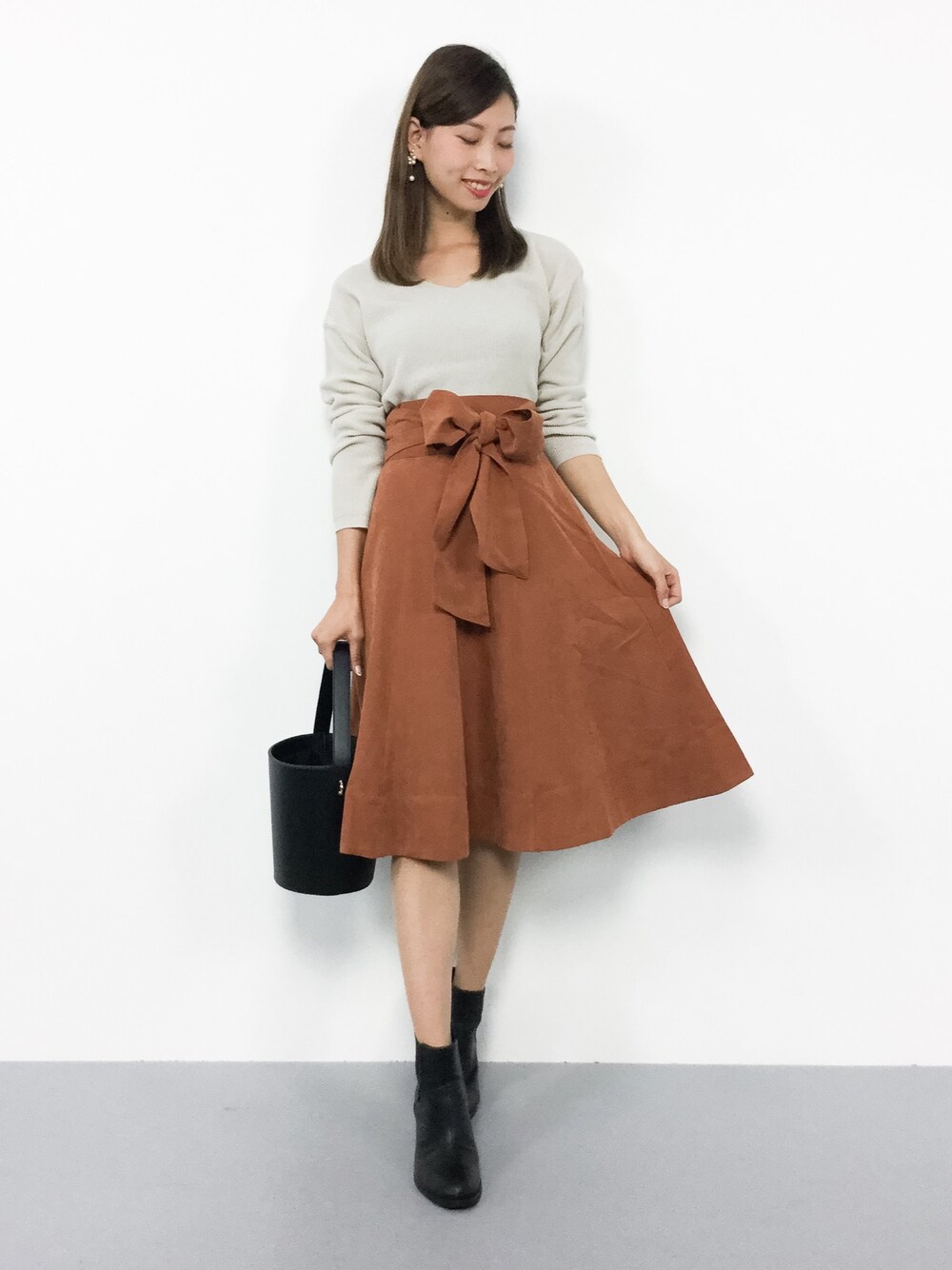 秋のデートコーデ◎ デイリーに着回しが効く畔編みニットは 様々なシーンで活躍間違いなし♪ フェイクスエードのスカートは 柔らかな生地で滑らかな肌触りです( ˆoˆ )/