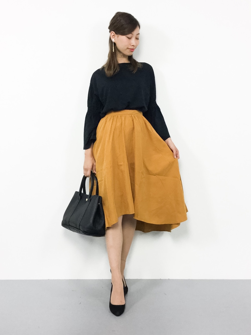 きれいめオトナコーデ◎ デイリーに着回しが効くトップスは 様々なシーンで活躍間違いなし(^O^) スカートはウエストがゴムなので とっても楽な履き心地でしたよ♪ 上品なフレアスカートは足を細く 見せてくれるイレギュラーヘムが ポイントです(^_^)☆