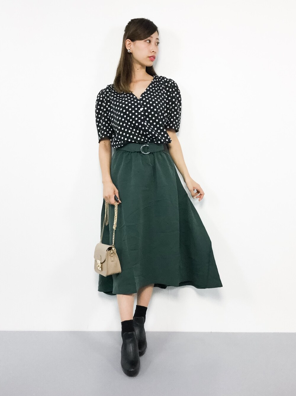 KIIのシャツ/ブラウス「【2017A/W】レトロな雰囲気漂う◆ドットプリント立体パフスリーブVネックフロントボタン半袖ブラウス」を使ったコーディネート