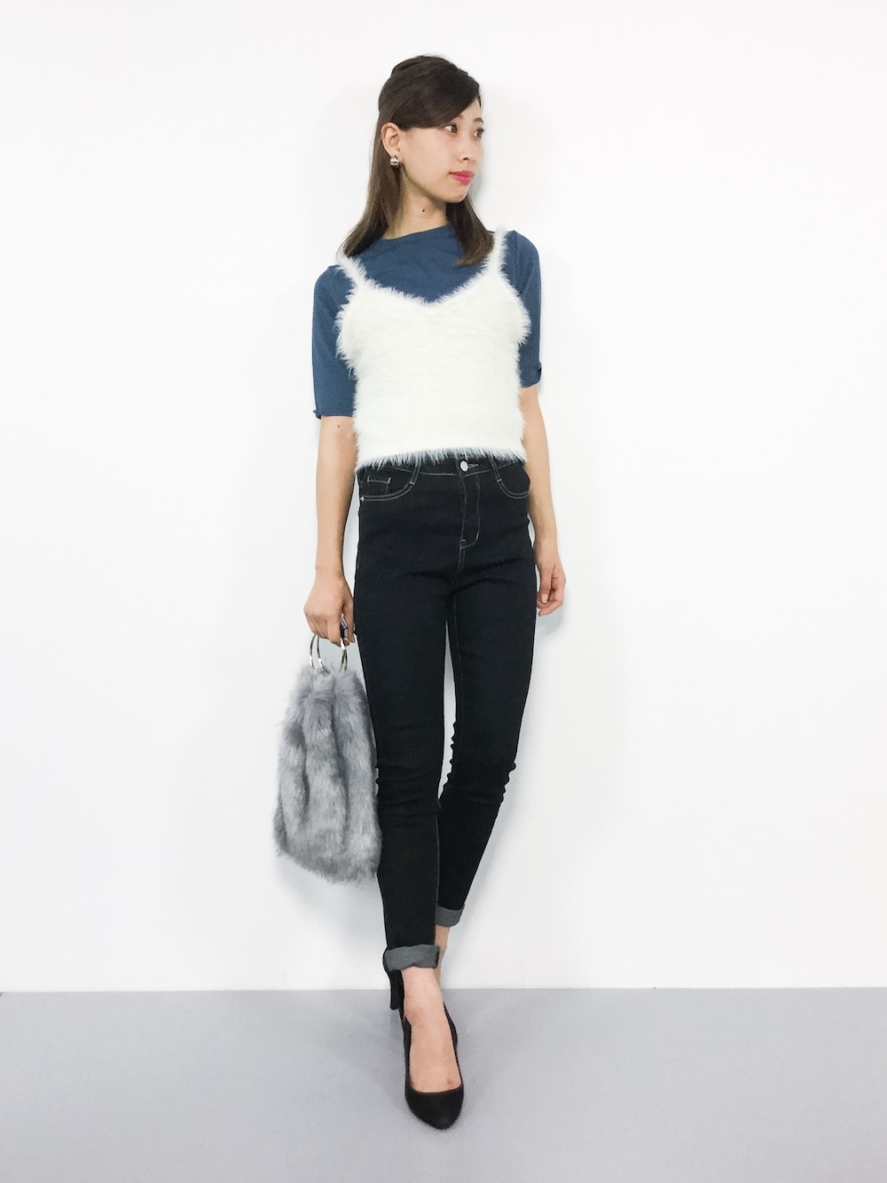 カジュアルコーデ◎ シャギービスチェはふわふわで 触り抜群♩着心地◎です‼︎ シンプルなスキニーデニムは トップスを選ばずに穿けるので、 使いやすいアイテムです(^_^)☆ シーズン問わず穿けるので 何本あっても嬉しいですよね♩