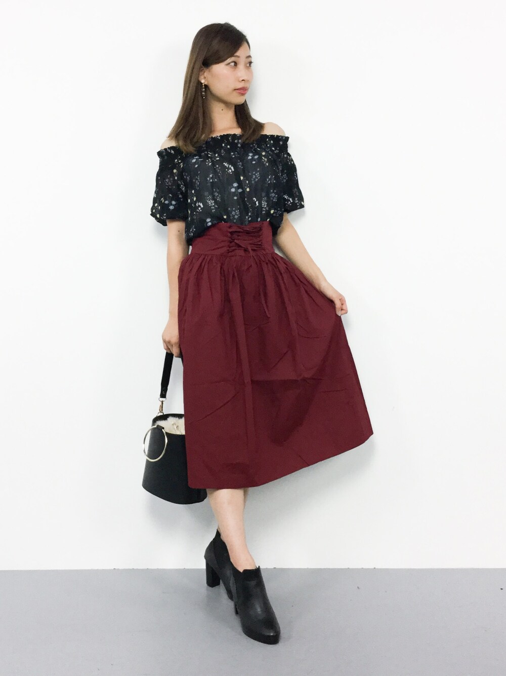 秋のガーリーコーデ◎ 花柄のオフショルブラウスは軽い素材で コーデにプラスするだけでガーリーに♪ スカートは柔らかな生地で 幅広いシーズン使える優秀アイテムです(^_^)☆