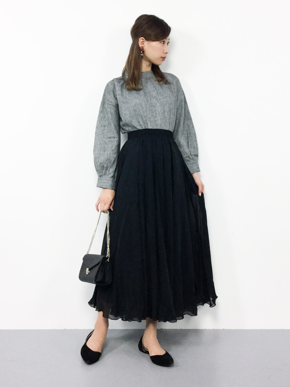 オトナカジュアルコーデ◎ ゆったりしたシルエットのハイネックブラウスは ボトムスを選ばずに着ていただけます♪ ふわっとしたシフォンスカートは 穿くだけで女性らしいアイテム♩ カジュアルにもガーリーにも着回せます(^_^)☆