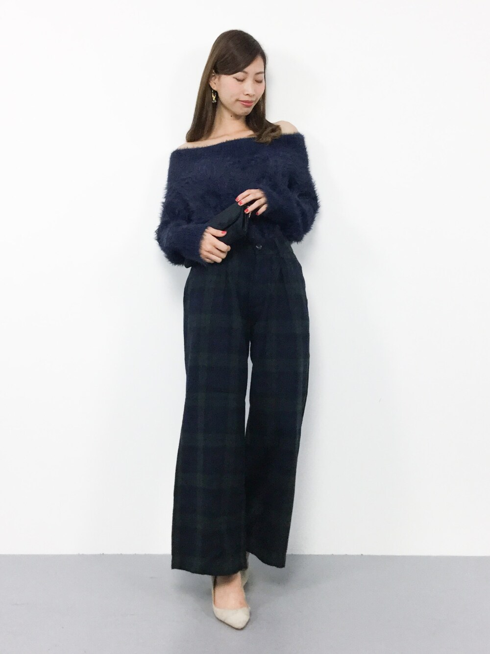 秋色コーデ◎ フェザーヤーンのオフショルニットは、 可愛らしく女性らしいシルエットに♪ パンツは程よいワイド感穿き心地よし♪ シンプルなアイテムなので 合わせやすいですよ(^O^)