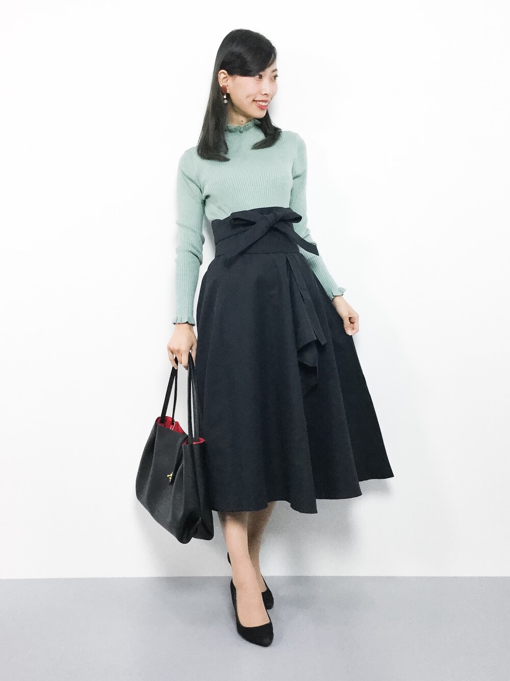 きれいめカジュアルコーデ◎ ハイネックのフリルが可愛い ニットは、柔らかな生地で とても着やすいです♪ ふわっとしたフレアスカートは カジュアルにもガーリーにも着回せます(^_^)☆