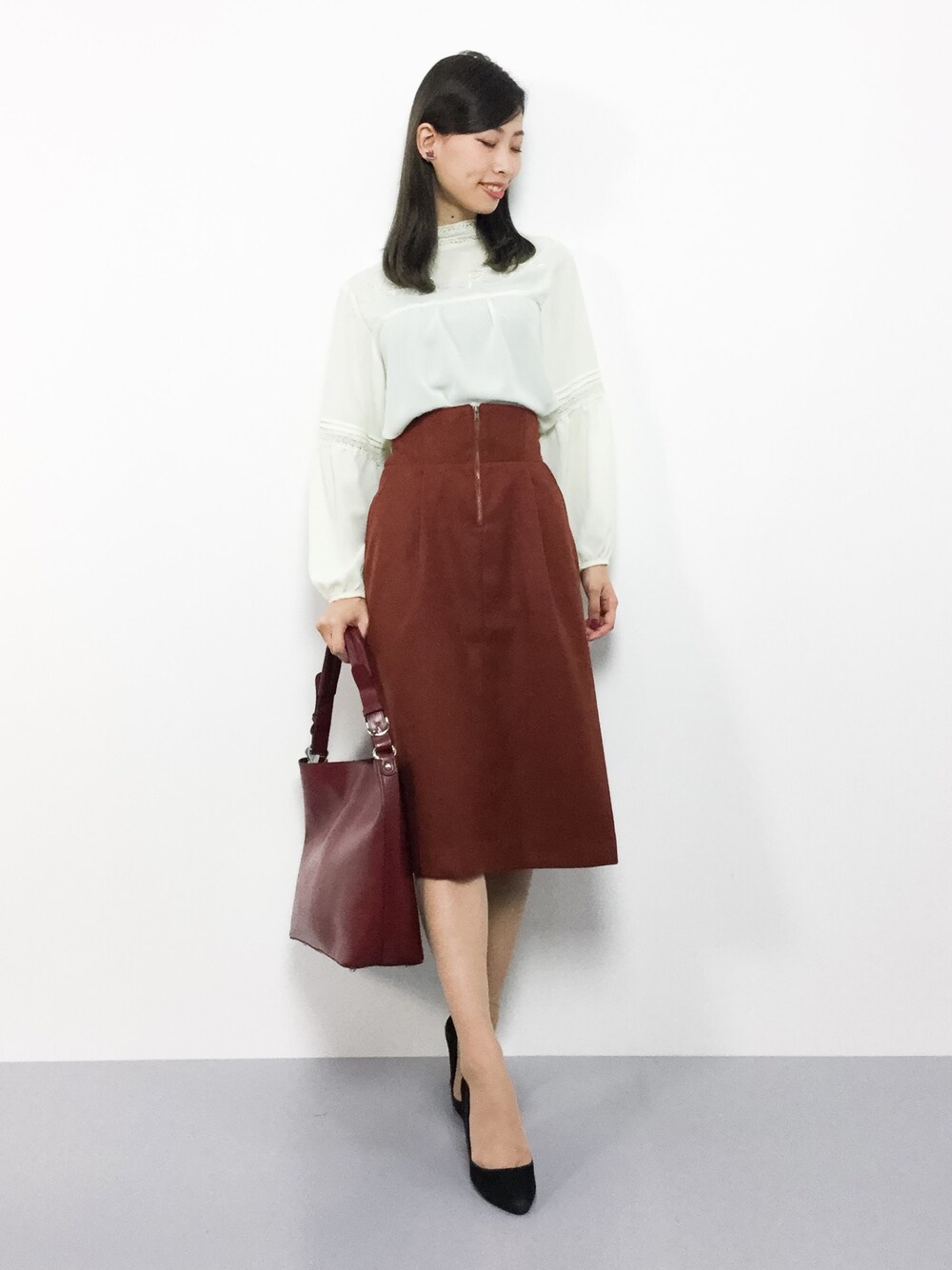 カジュアルコーデ◎ オンオフに着回しが効くブラウスは 様々なシーンで活躍間違いなし♪ スカートは台形なので、 足がスッキリと見えるデザインです(^_^)
