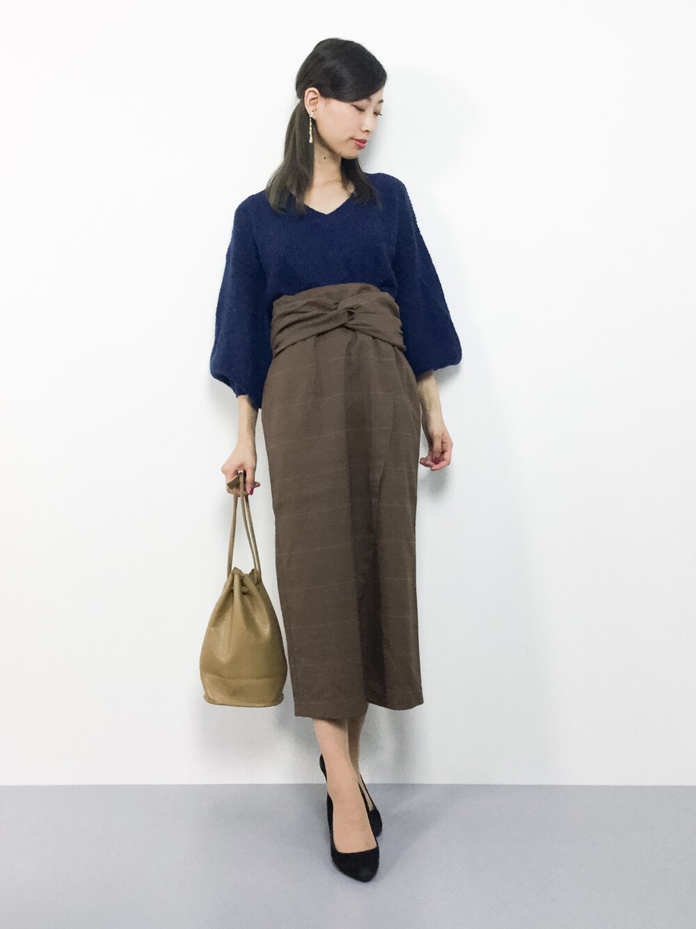 オトナきれいめコーデ◎ ゆるゆるシルエットのニットは ボトムスをスッキリさせてバランスよく♩ スカートはタイトな作りですが、 生地が柔らかく穿きやすいです(^O^) グレンチェック柄でトレンドアイテムです♩