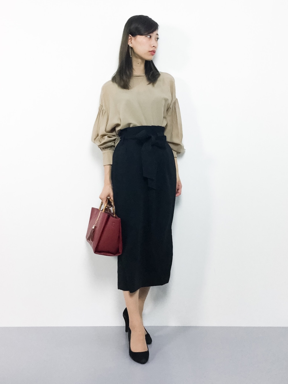 オトナシンプルコーデ◎ ハイネックのブラウスは、柔らかな生地で とても着やすいです☆ スカートはタイトなシルエットですが、 伸縮性があり、スリットが入っているので 穿きやすいです(^_^)☆