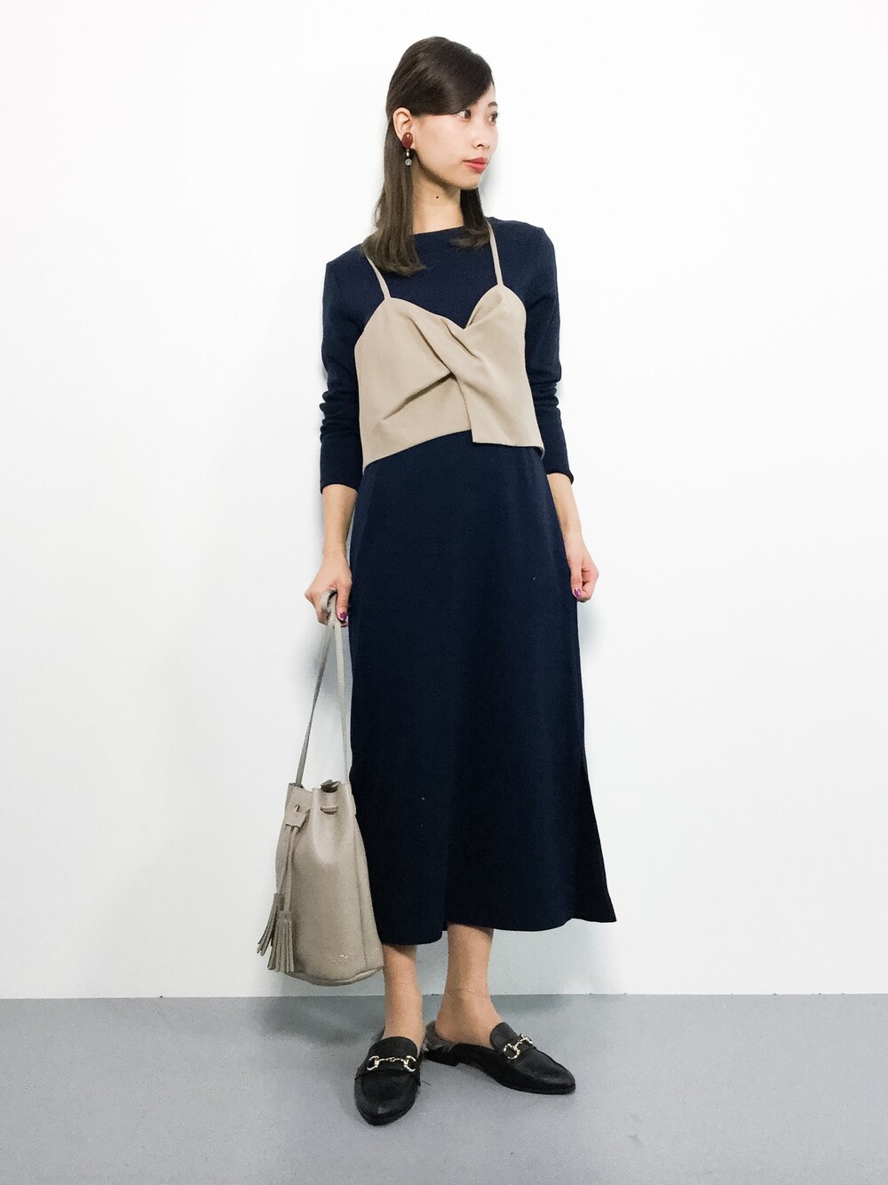 ワンピース&ビスチェコーデ◎ ゆったりシルエットのワンピースは バブーシュでカジュアルに♪ バレエシューズでガーリーに 仕上げても可愛いですよ(^O^)