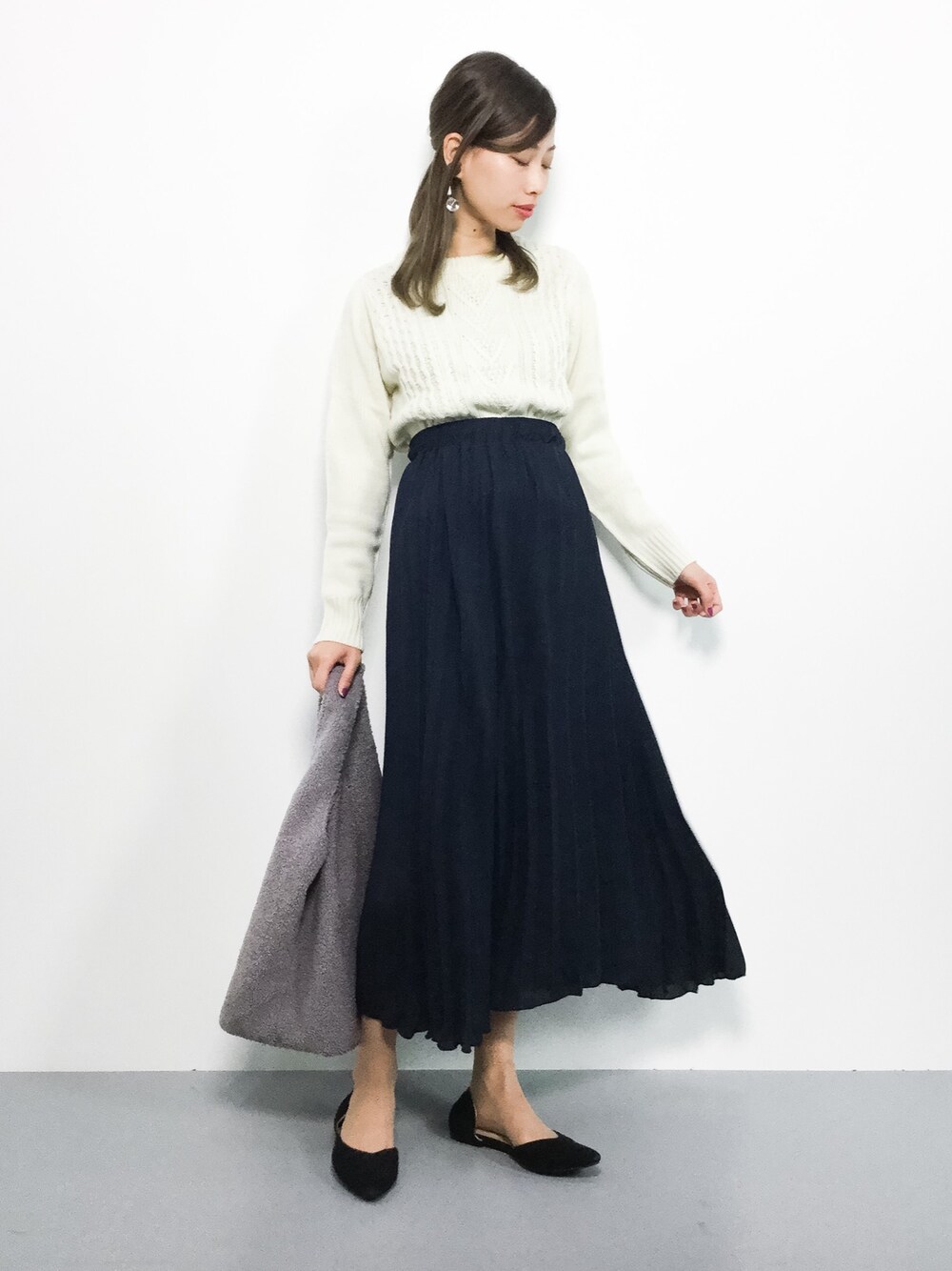 カジュアルゆるコーデ◎ ゆったりシルエットのケーブルニットは ボトムスを選ばずに着られるので 合わせやすいですよ★ 柔らかな生地のプリーツスカートは歩くたびに裾が 揺れてとっても可愛らしくフェミニン♪