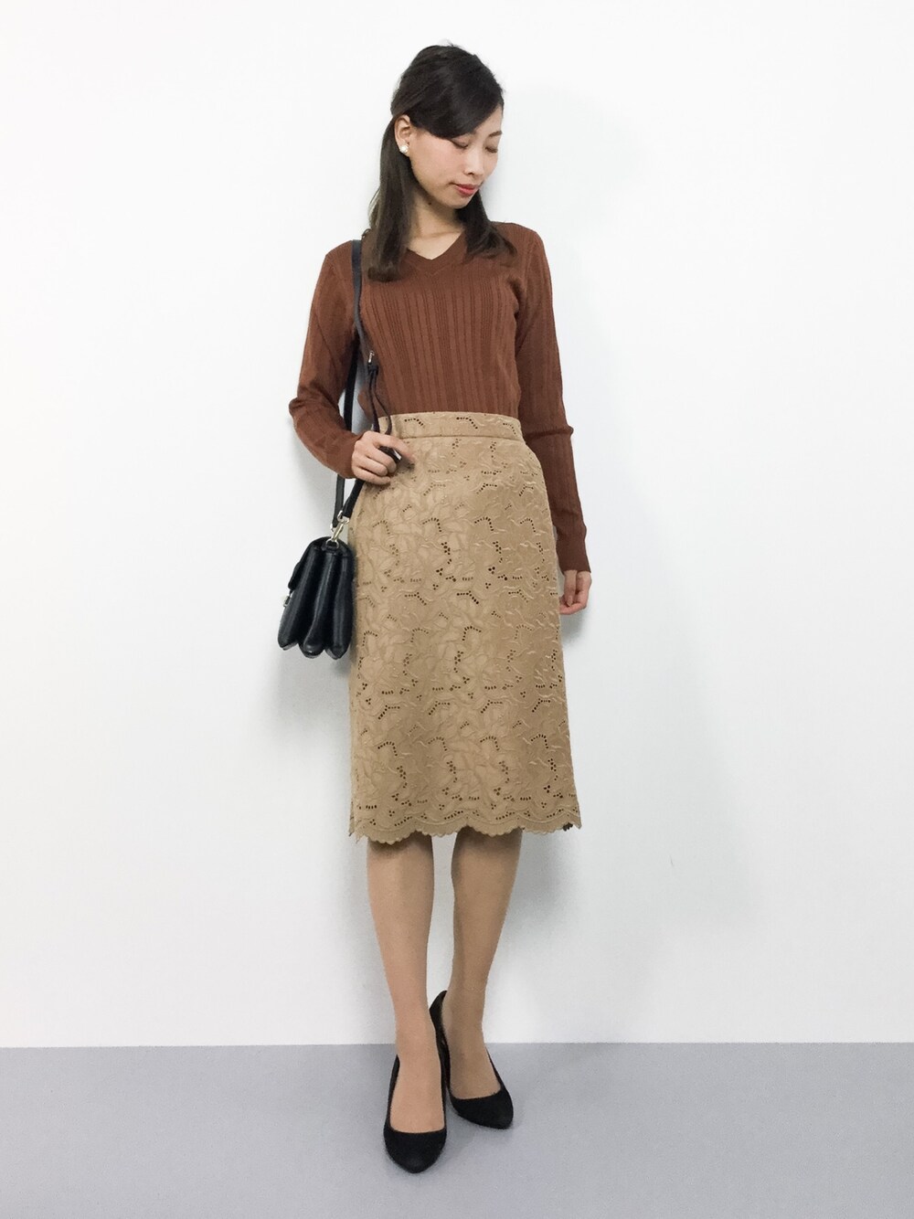 シンプルタイトコーデ◎ デイリーに着回しが効くニットは 様々なシーンで活躍間違いなし♪ ハイウエストで穿けるタイトスカートは スタイルアップ効果ばっちり♩ スッキリシルエットで穿きやすいです(^_^)☆