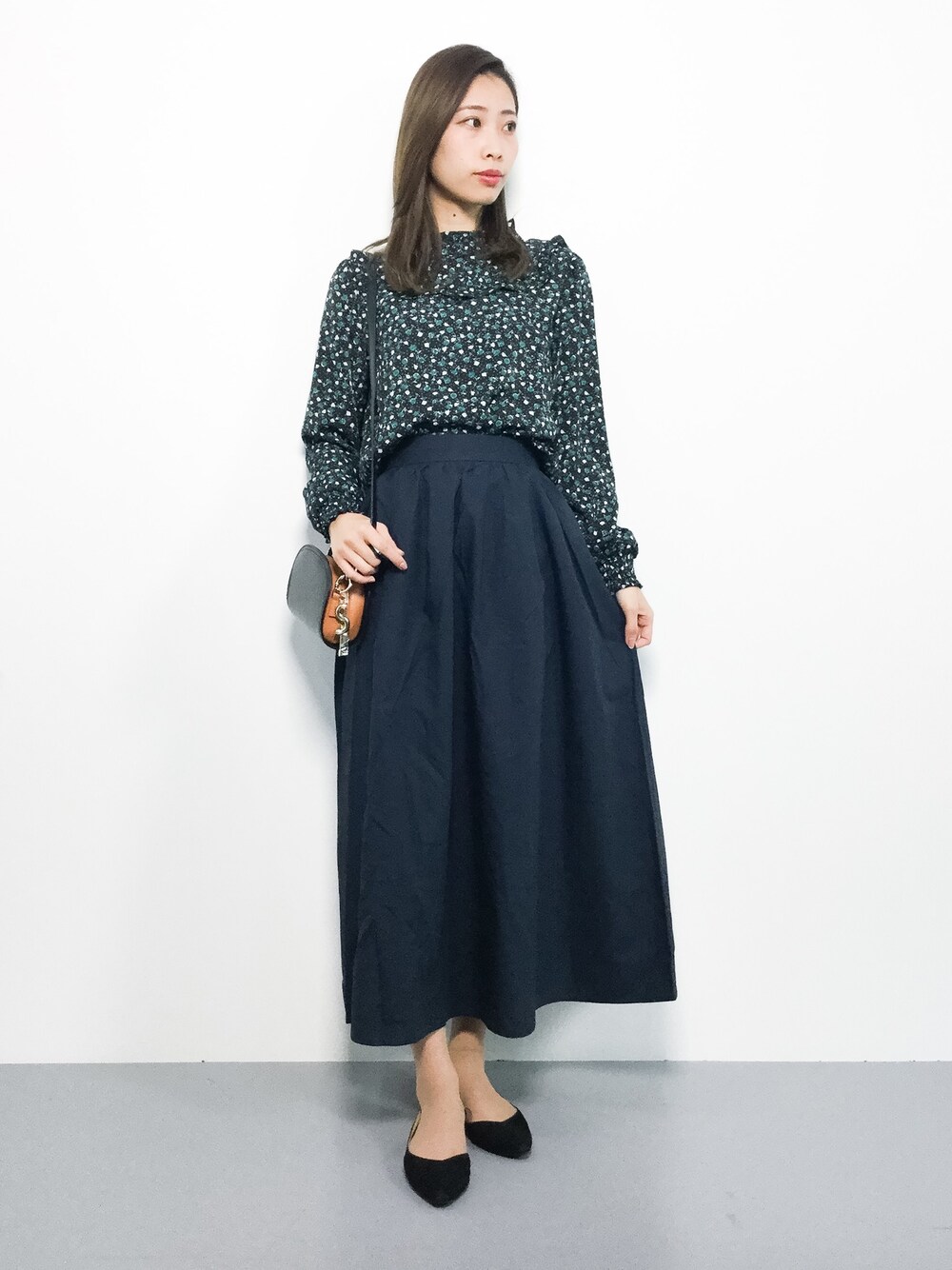 オトナカジュアルコーデ◎ ハイネックのフリルが可愛い トップスは、柔らかな生地で とても着やすいです(^_^)☆ スカートは少しハリ感があり、 足元の合わせ次第でカジュアルにも きれいめにも穿けますよ(^O^)