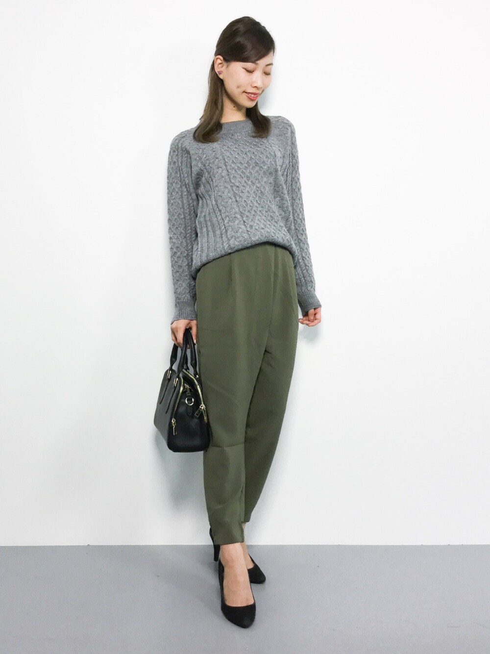 シンプルコーデ◎ ゆったりシルエットのケーブルニットは ボトムスを選ばずに着られるので 合わせやすいですよ★ パンツはスッキリとしたシルエットですが、 伸縮性がしっかりとあり、 とても穿きやすいです(^_^)☆