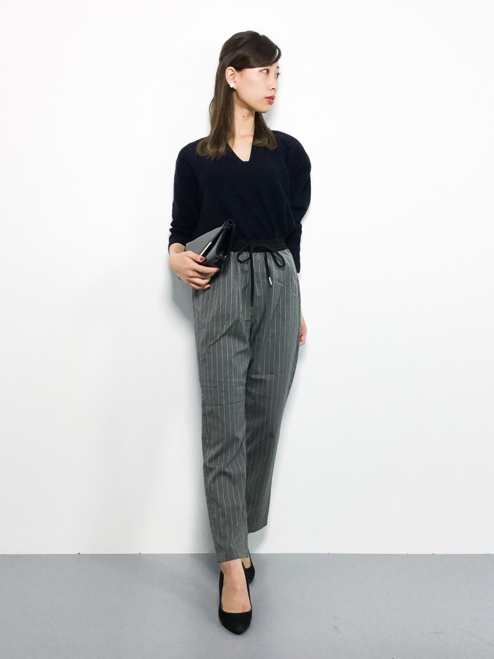 きれいめコーデ◎ ゆったりシルエットのニットは ボトムスを選ばずに着られるので 合わせやすいですよ★ パンツはスッキリシルエットですが 細すぎないので穿きやすいですよ♩