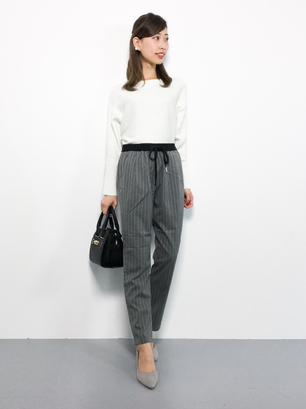 きれいめシンプルコーデ◎ ゆったりしたシルエットのラメニットは ボトムスを選ばずに着ていただけます♪ パンツはすそに向かって細くなっているので きれいなシルエットで穿いていただけます(^O^)