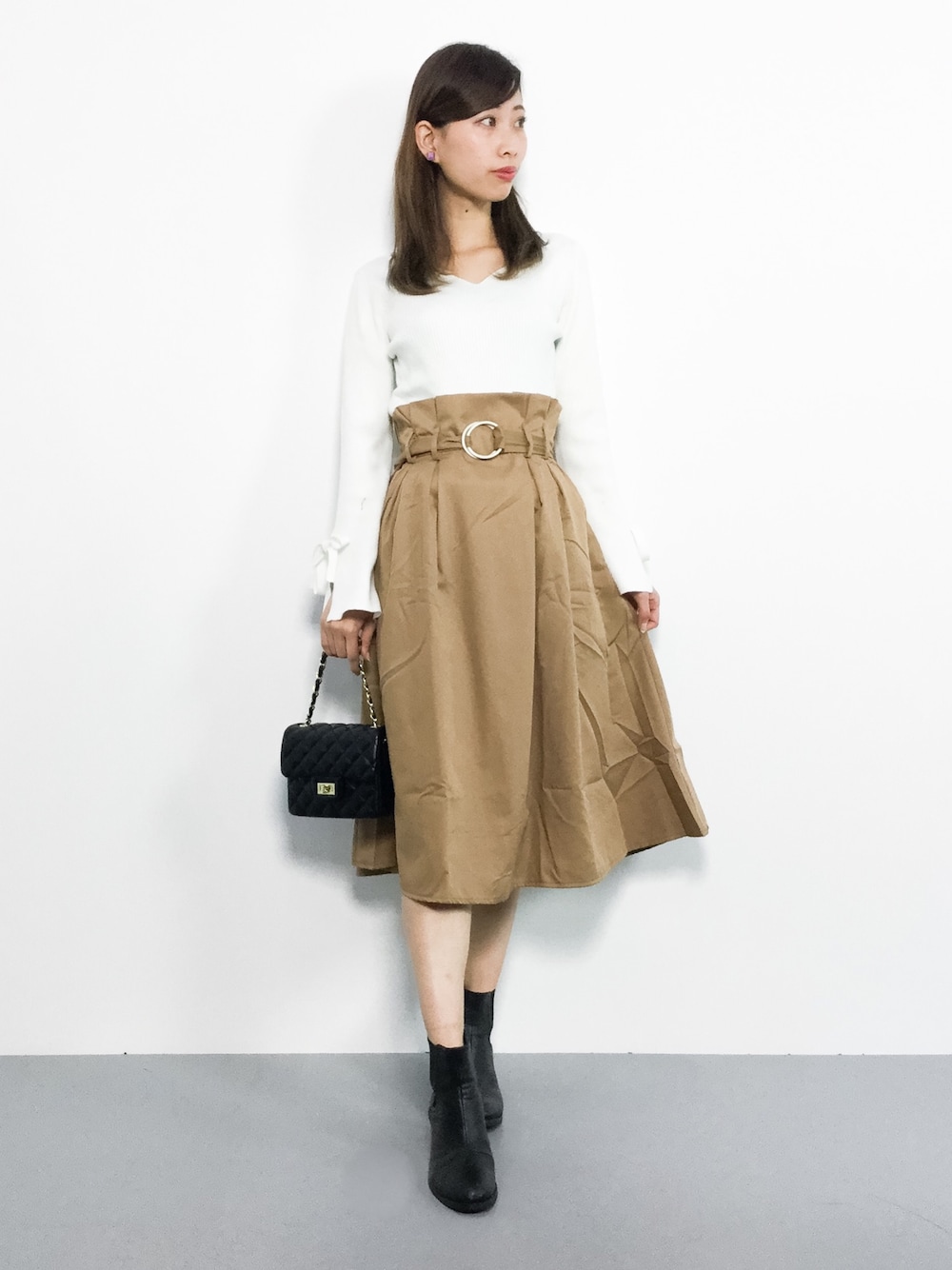 カジュアル秋コーデ◎ ゆったりしたシルエットのニットは ボトムスを選ばずに着ていただけます(^O^) スカートは柔らかな生地で 幅広いシーズン使える優秀アイテム♪