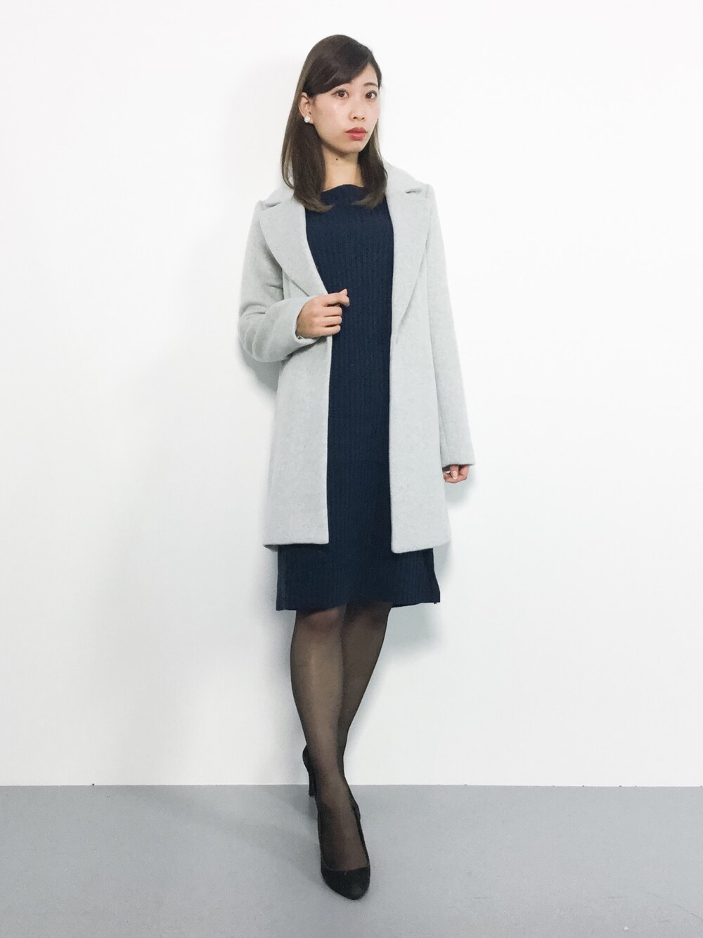 オトナ女子コーデ◎ ストンとした形のIライン ワンピースはスタイルアップして見える 嬉しいアイテム♪ チェスターコートは定番型なのでトレンドを 気にせず使えるアイテムです(^_^)☆