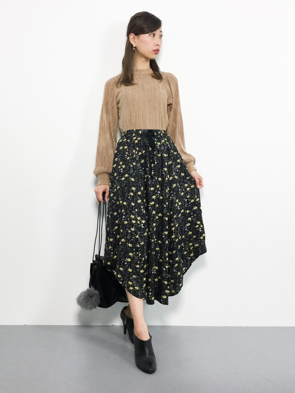 オトナ女子コーデ◎ ベロアのプリーツトップスはコーデに プラスするだけで季節感の でるアイテムです(^O^) サラっとした素材の花柄スカートは幅広い シーズンでお使いいただけます(^O^)
