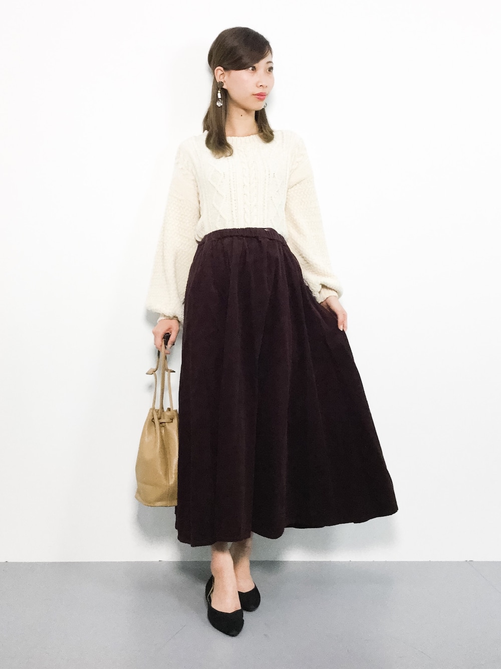 カジュアルデートコーデ◎ ゆったりシルエットのケーブルニットは ボトムスを選ばずに着られるので 合わせやすいですよ★ コーデュロイ素材のスカートは穿くだけで 季節感のでるアイテムです( ˆoˆ )/ ゆとりのあるシルエットで穿きやすいです♩