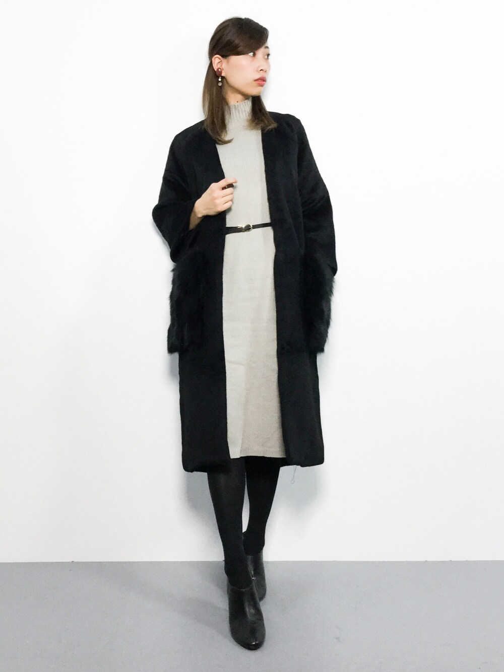 KIIのノーカラージャケット「NANING9(ナンニング)モヘアポケットガウンコート」を使ったコーディネート