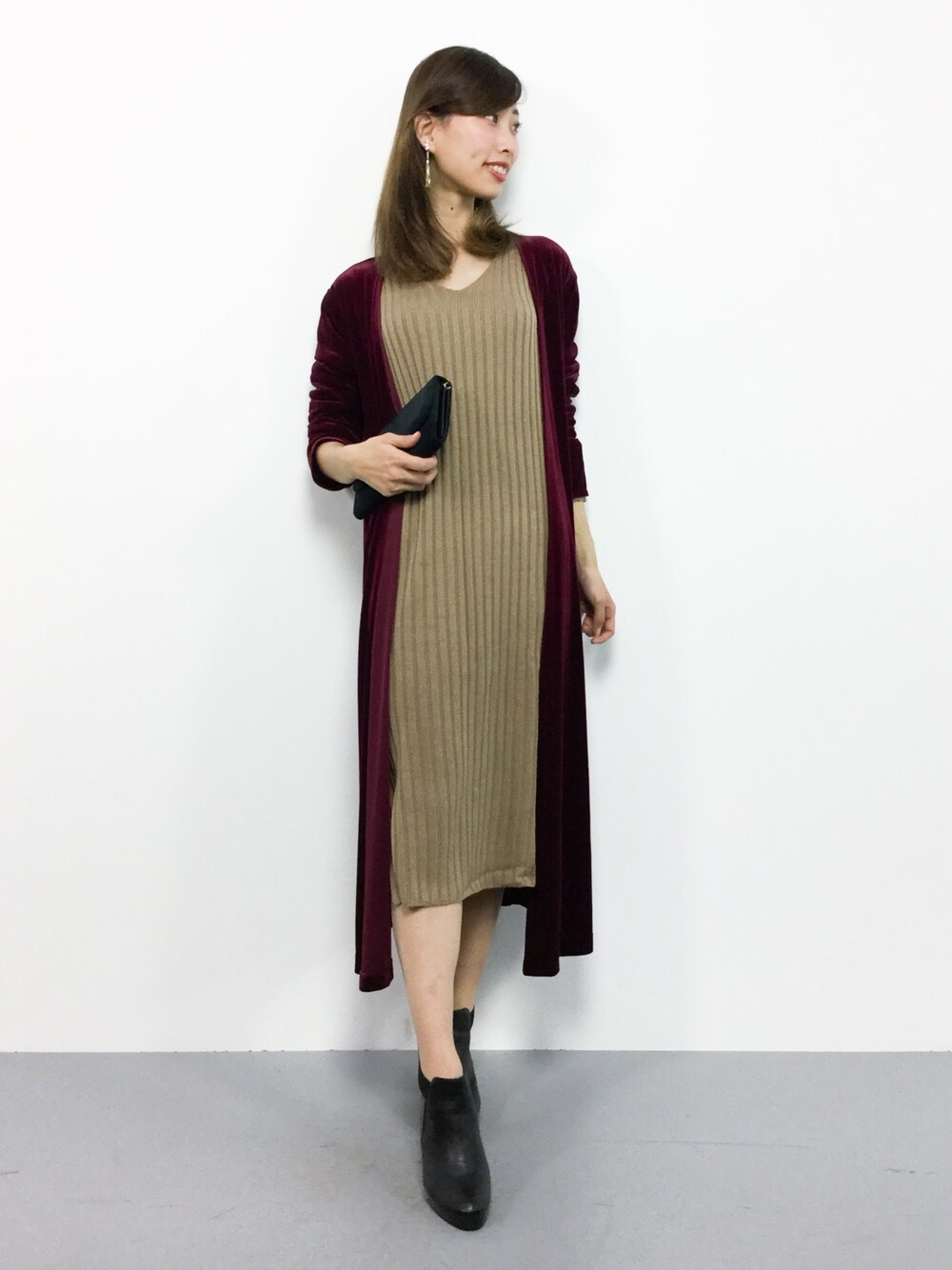 カジュアル秋コーデ◎ ストンとした形のIライン ワンピースはスタイルアップして見える 嬉しいアイテム♪ ゆったりしたカーディガンは腰周りを さりげなくカバー(^_^)☆ ベロア素材で肌触りも◎です♪