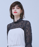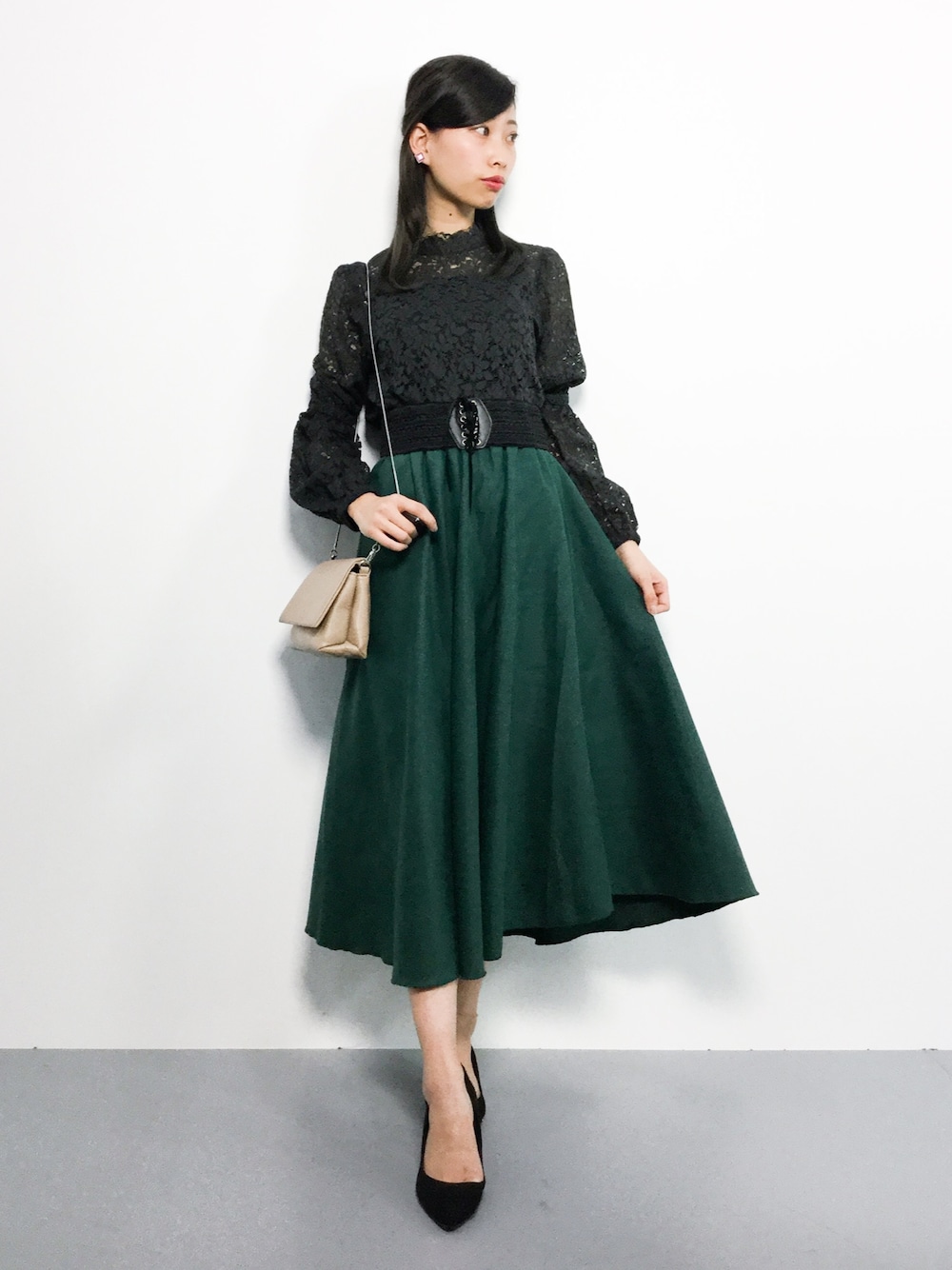 オトナフェミニンコーデ◎ トレンドのレーストップスは シンプルな形で着回しやすさばっちり♩ スカートは柔らかな生地で 幅広いシーズン使える優秀アイテム♪ ヘムラインの裾で足がスッキリ見えます♩