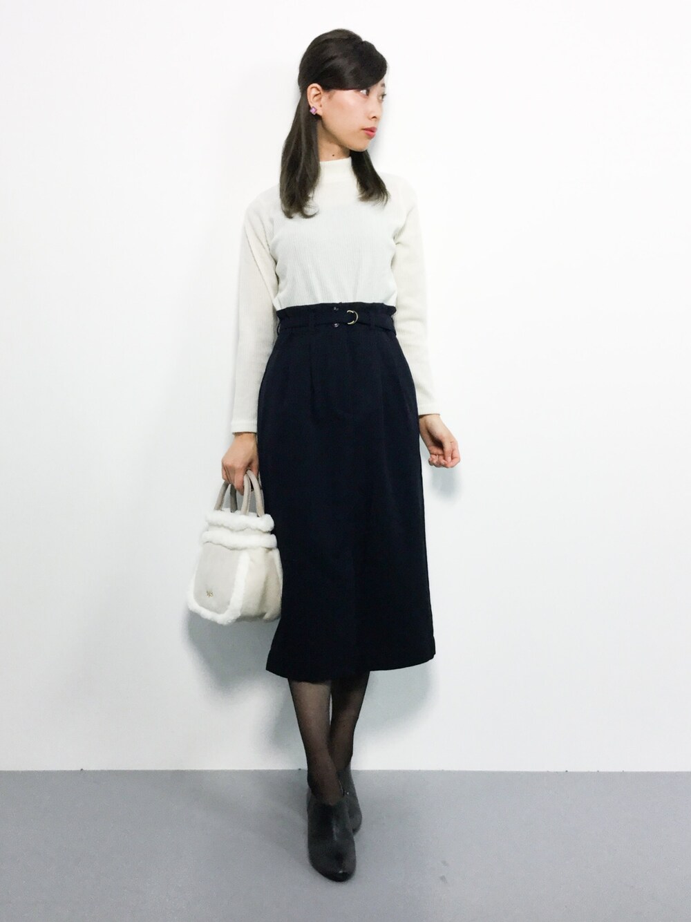 カジュアルコーデ◎ デイリーに着回しが効くボトルネックニットは 様々なシーンで活躍間違いなし♪ スカートはウエストがゴムなので とっても楽な履き心地でしたよ( ´ ▽ ` )