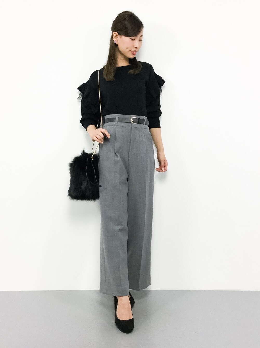 ラフコーデ◎ ゆったりシルエットのフリルレースニットは ボトムスを選ばずに着られるので 合わせやすいですよ★ トレンドのワイドパンツは ハイウエストでスタイルアップ♩ ゆったりした作りなので穿きやすいです(^_^)☆