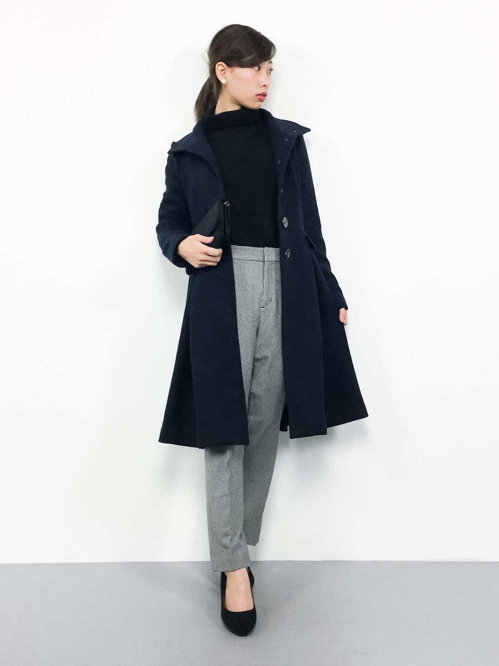 オトナコーデ◎ 女性らしいシルエットのコートで フェミニンな印象に(^_^) デイリーに着回しが効くタートルネックニットは 様々なシーンで活躍間違いなし♪ パンツはスッキリシルエットですが 細すぎないので穿きやすいですよ♩