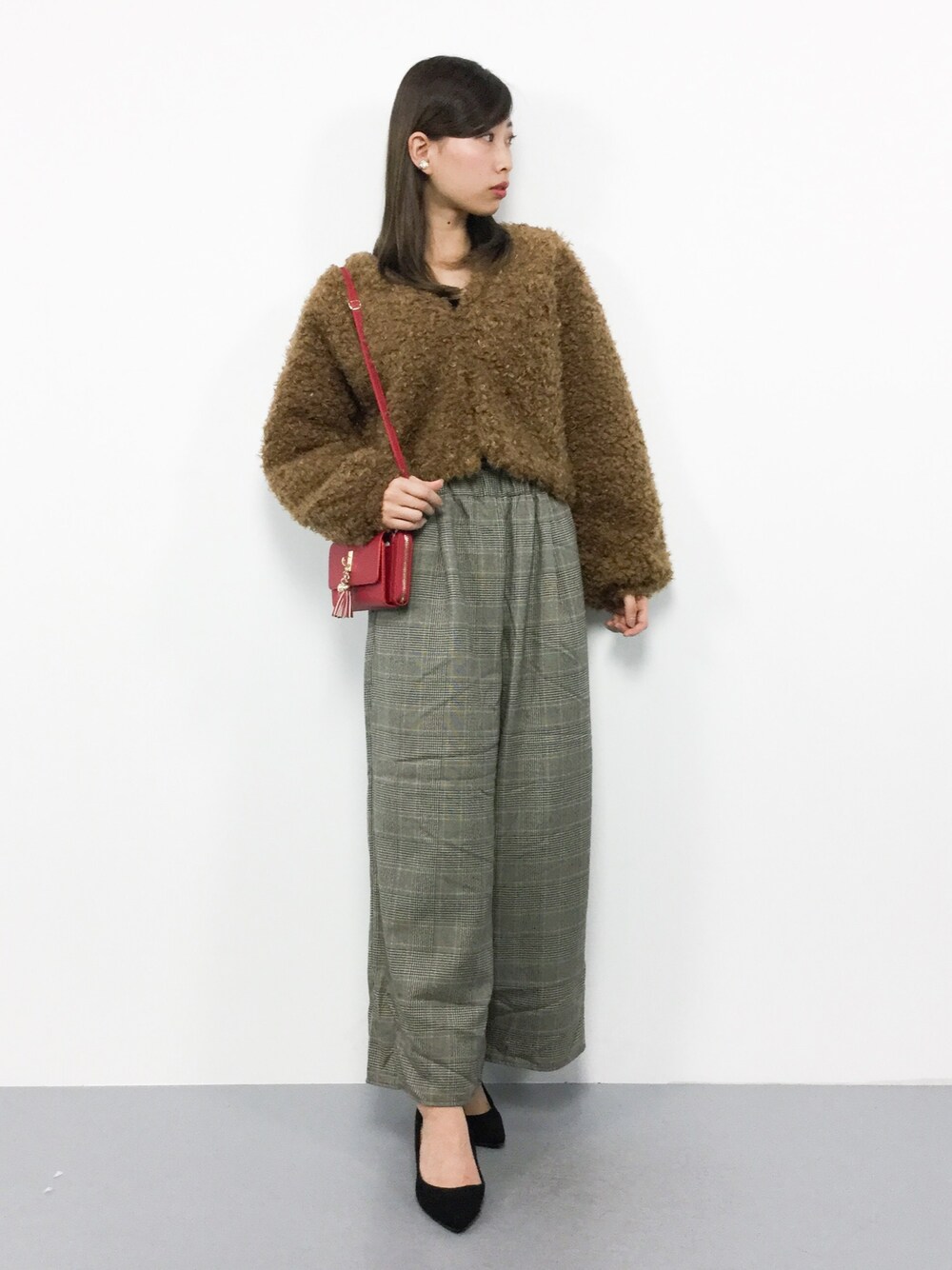 ブラウンラフコーデ◎ モコモコカーディガンは 着るだけで女の子らしいコーデに♩ 柔らかな生地です(^_^)☆ パンツはゆったりとした作りで 生地が柔らかく穿きやすいです(^O^) グレンチェック柄でトレンドアイテムです♩
